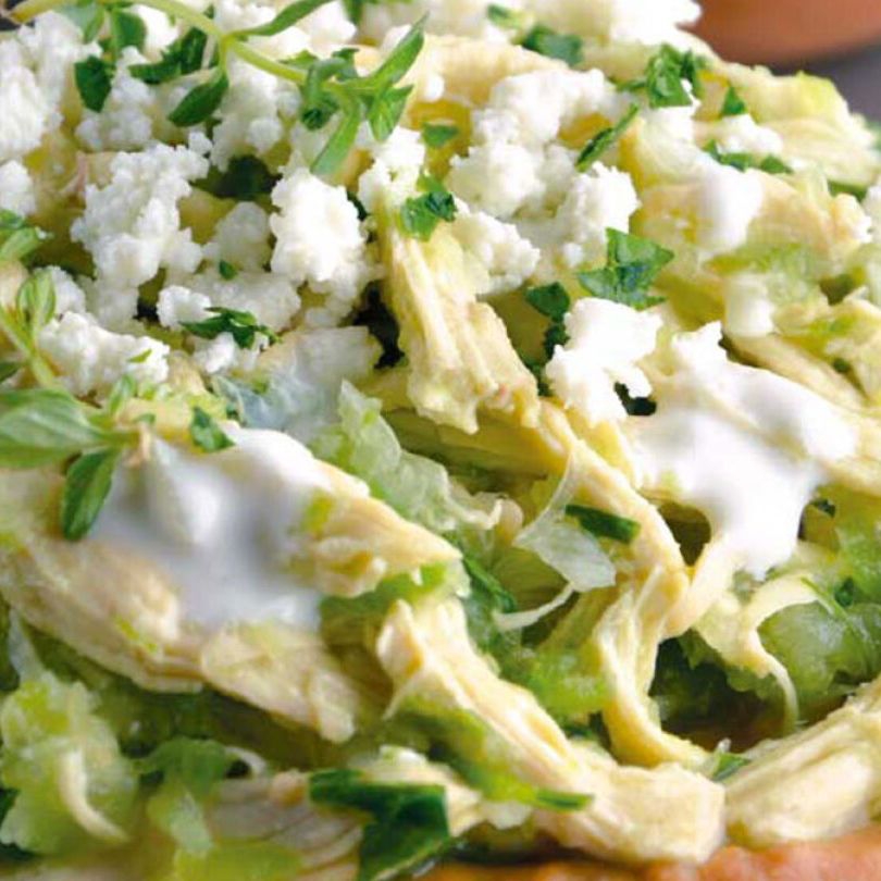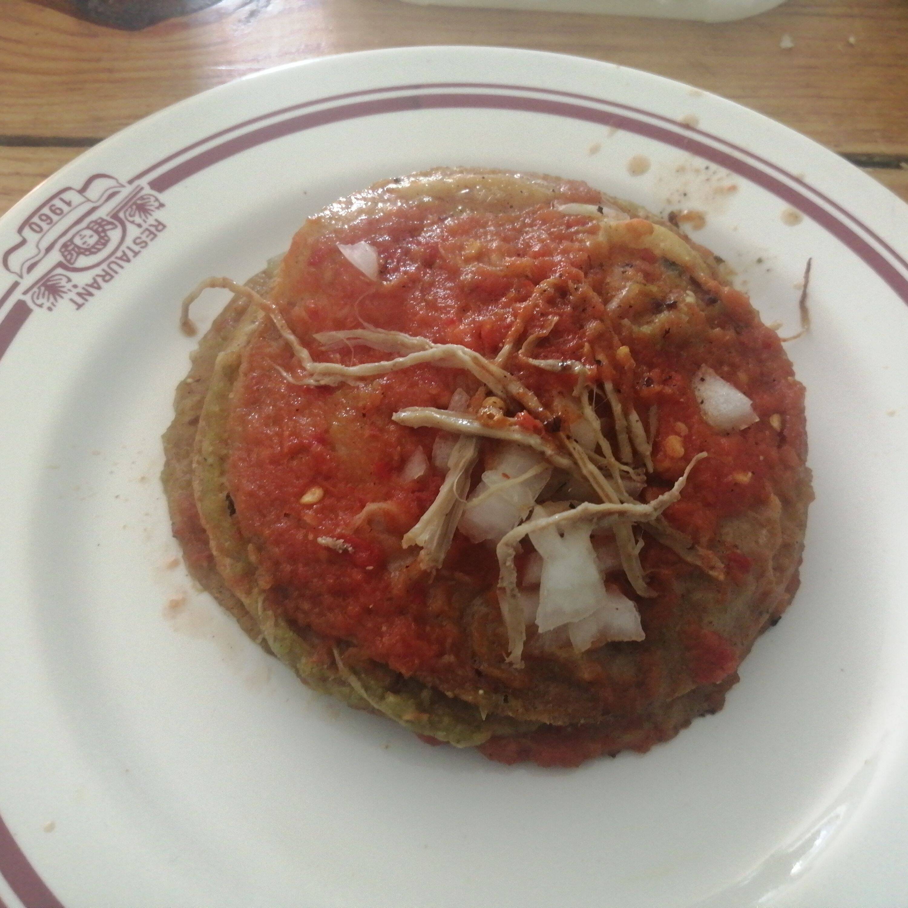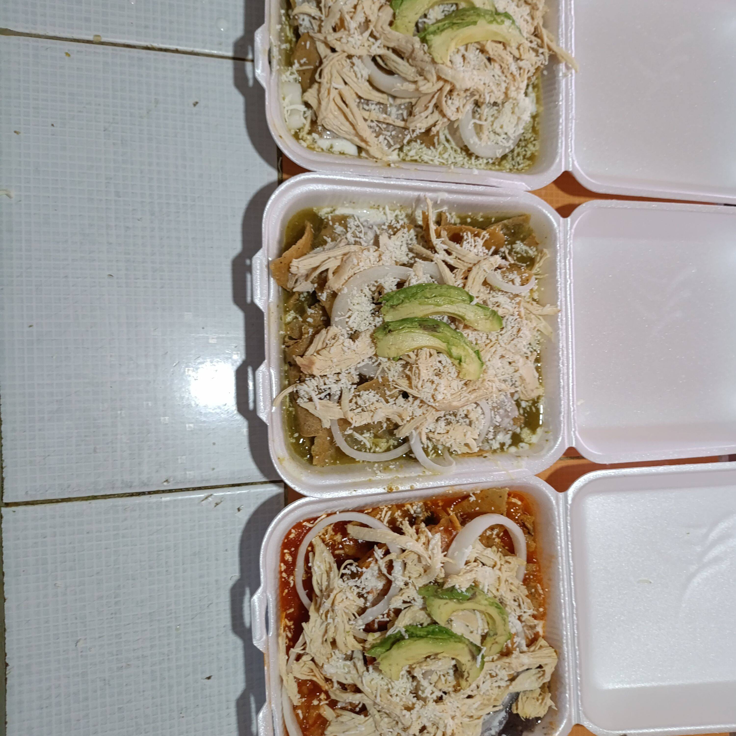 4 tortillas fritas ,bañadas en salsa de su elección, acompañados con proteína y crema ,queso y lechuga