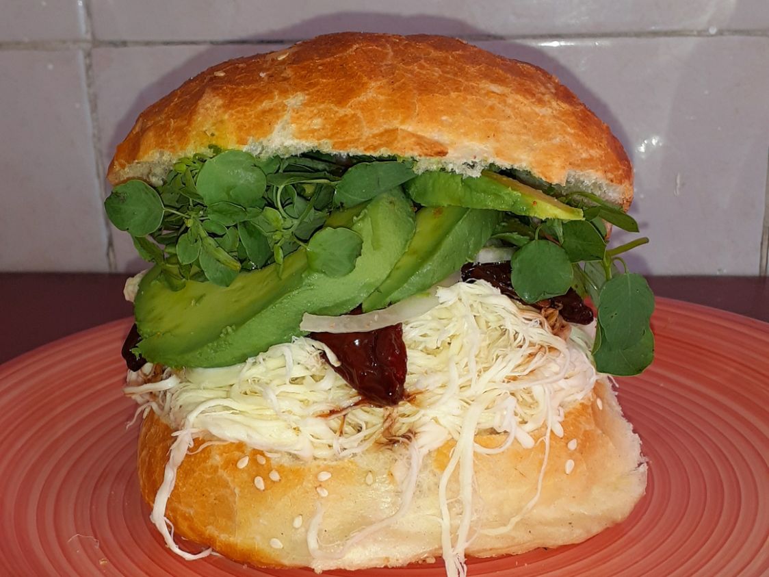 Con milanesa, quesillo, aguacate, picante, cebolla y papalo.