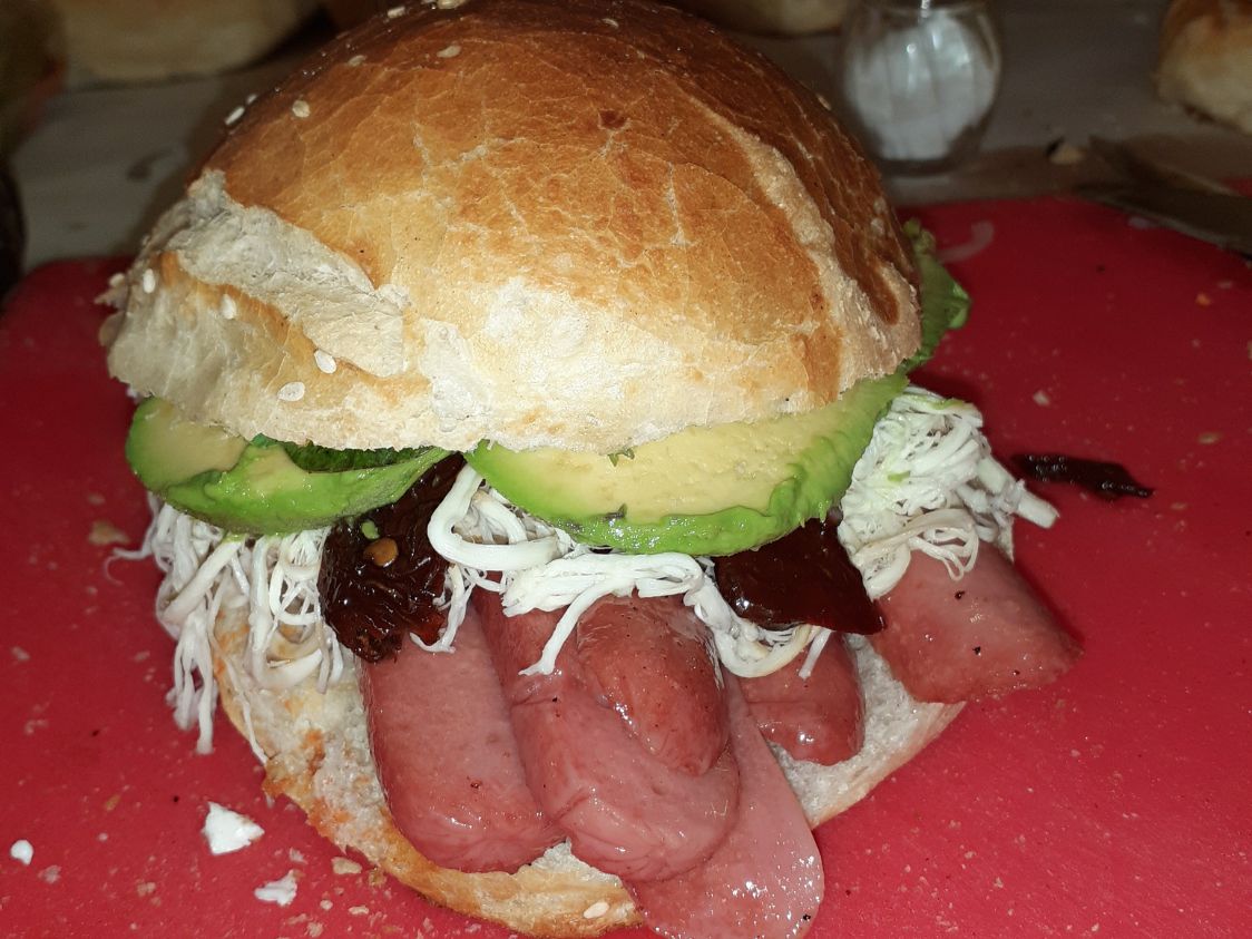 Milanesa, salchicha, aguacate, quesillo, picante, cebolla y pápalo.