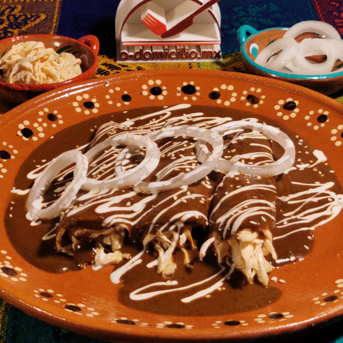 Carne enchilada, salchicha, quesillo, aguacate y cebolla.