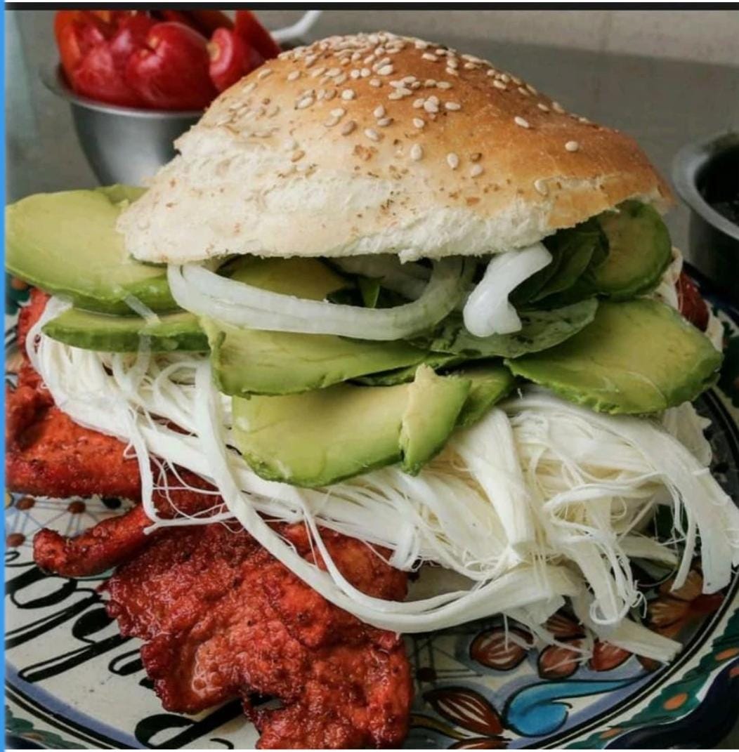 Pollo o cerdo, quesillo, aguacate, jitomate, mayonesa, frijoles, rajas o chipotle.