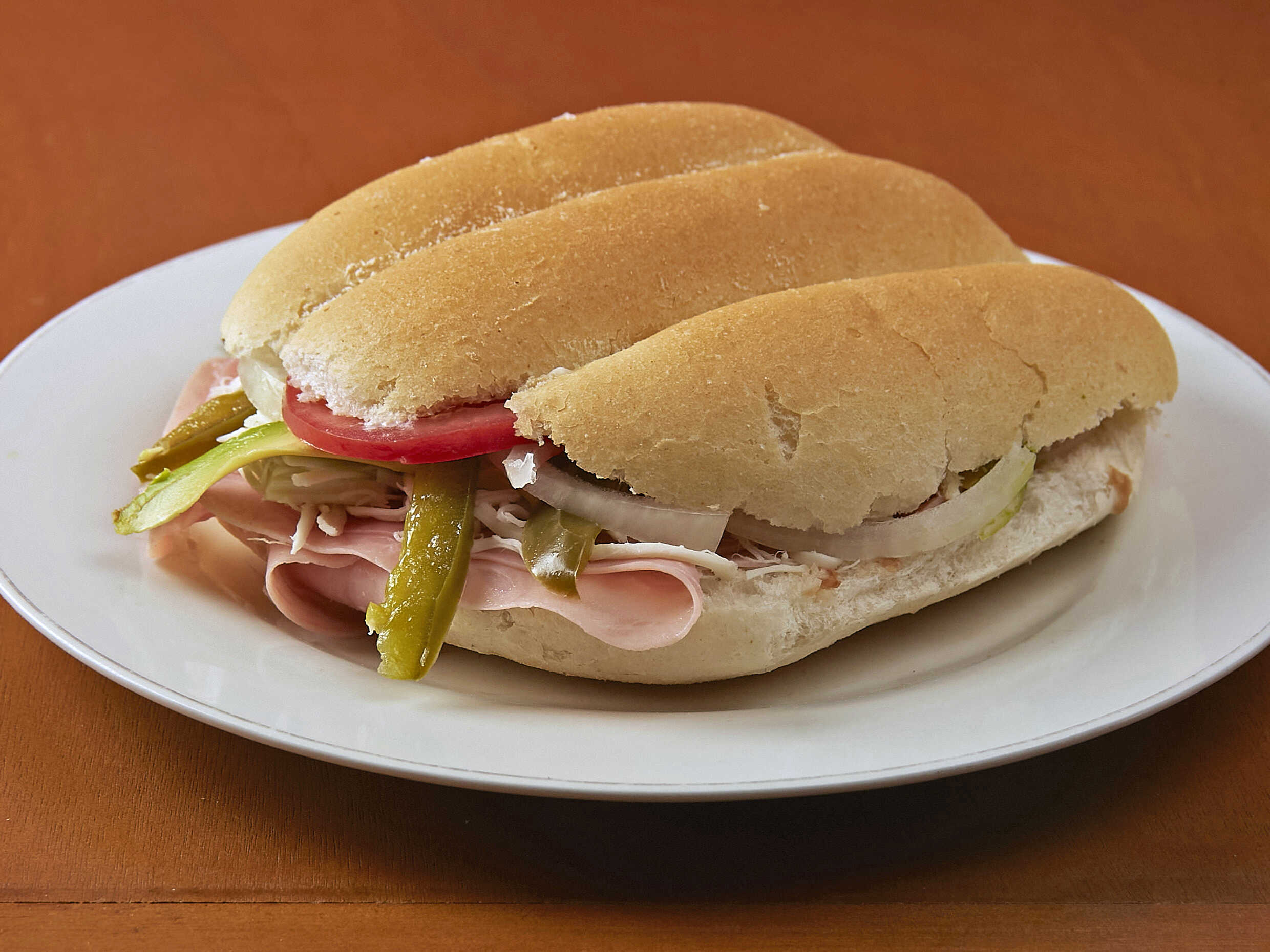 Pan de torta integrada por jamón, aguacate, frijoles, mayonesa, quesillo, jitomate, cebolla y picante a elegir.