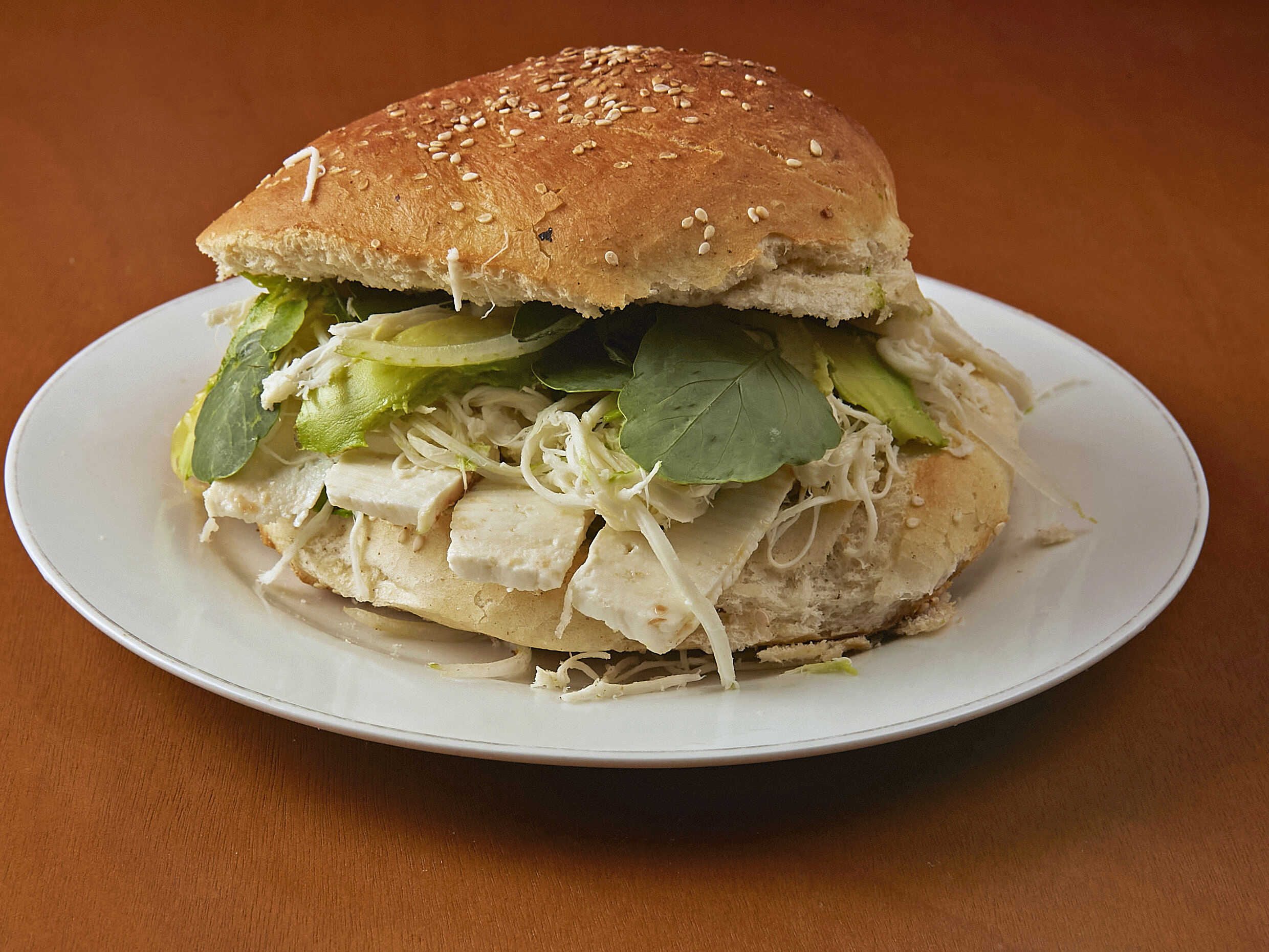 Pan tradicional de la cemita poblana integrada por milanesa de pollo, aguacate, quesillo, pápalo, cebolla y picante a elegir.