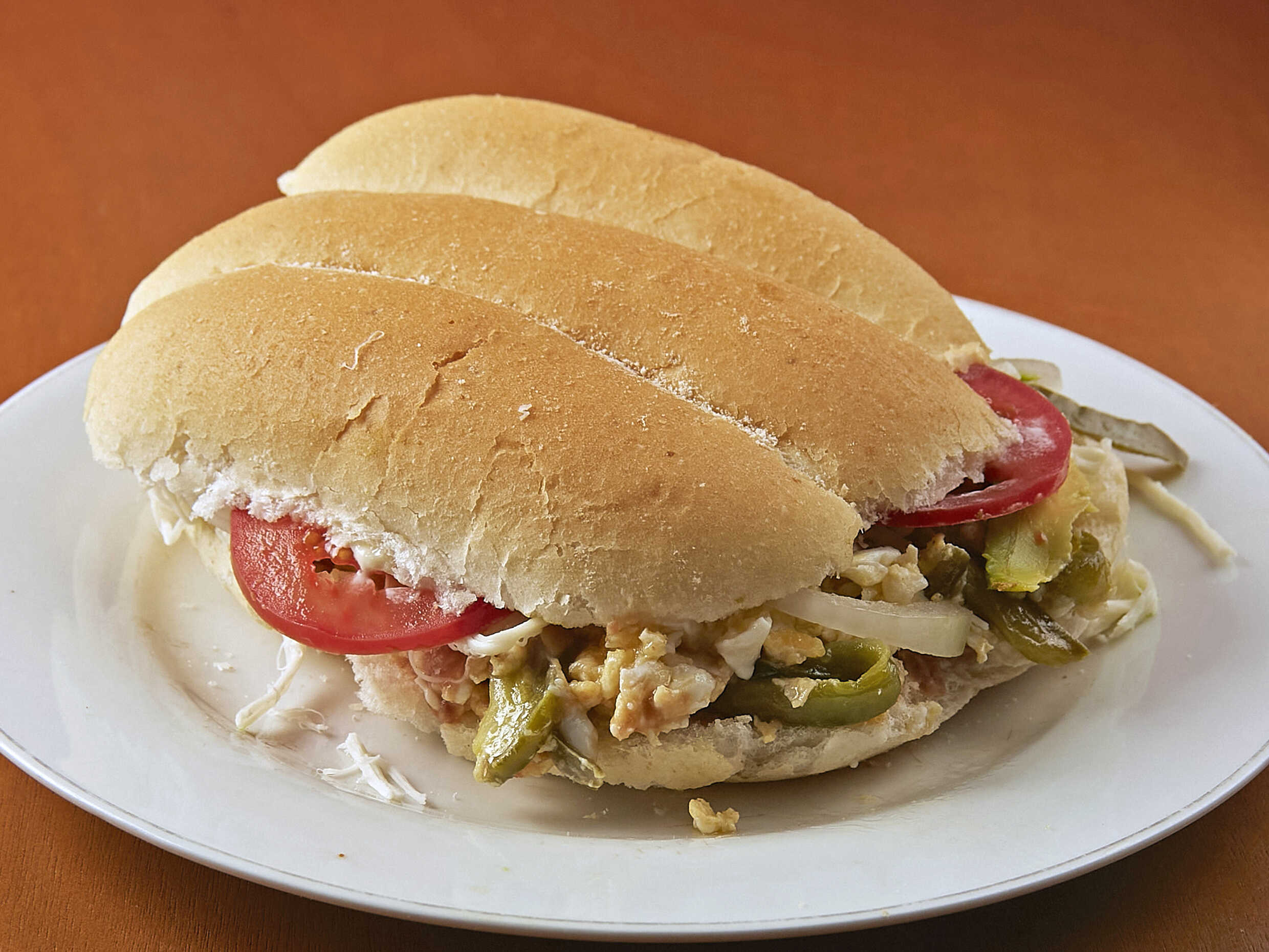 Pan de torta integrada por rajas con huevo revuelto, aguacate, frijoles, mayonesa, quesillo, jitomate, cebolla y picante a elegir.