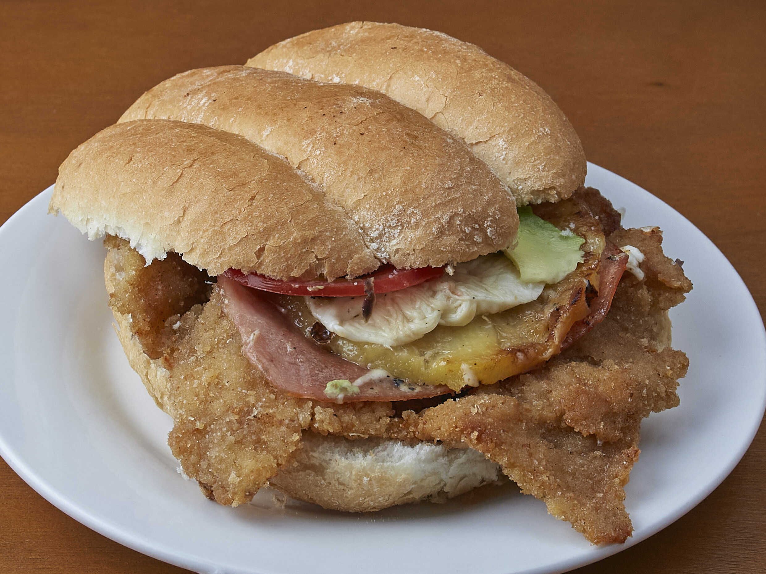 Pan de torta integrada por milanesa de cerdo, jamón, piña, quesillo derretido, aguacate, frijoles, jitomate, cebolla y picante a elegir.