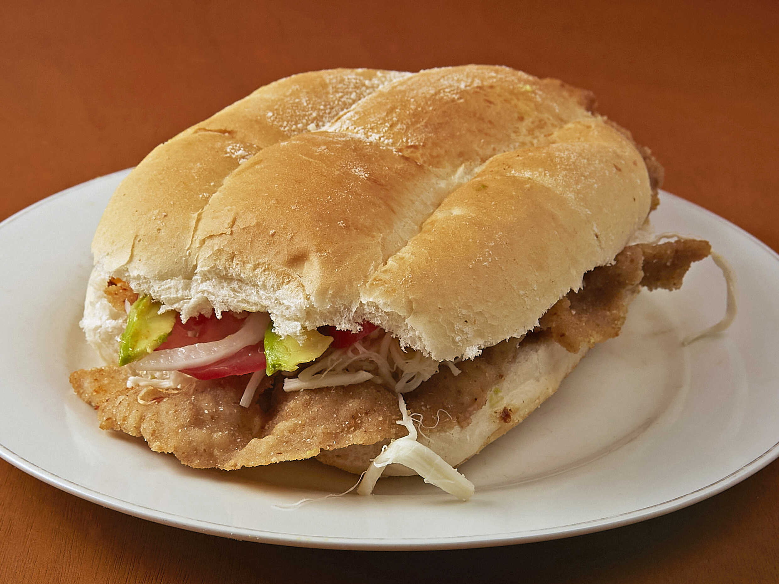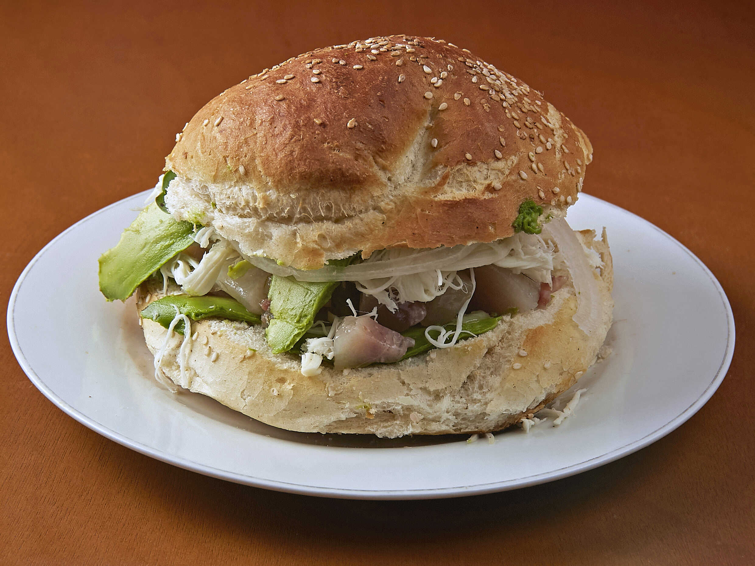 Pan de torta integrada por milanesa de cerdo, jamón, salchicha, queso, aguacate, frijoles, quesillo, jitomate, cebolla y picante a elegir.
