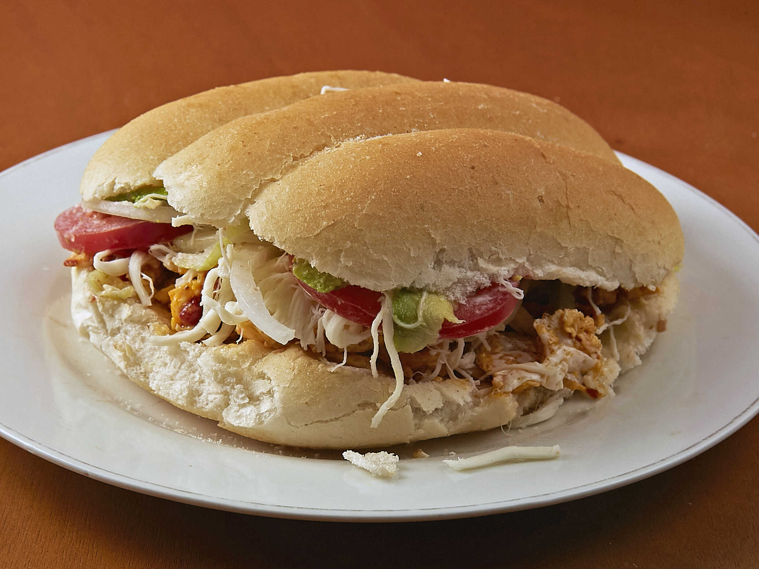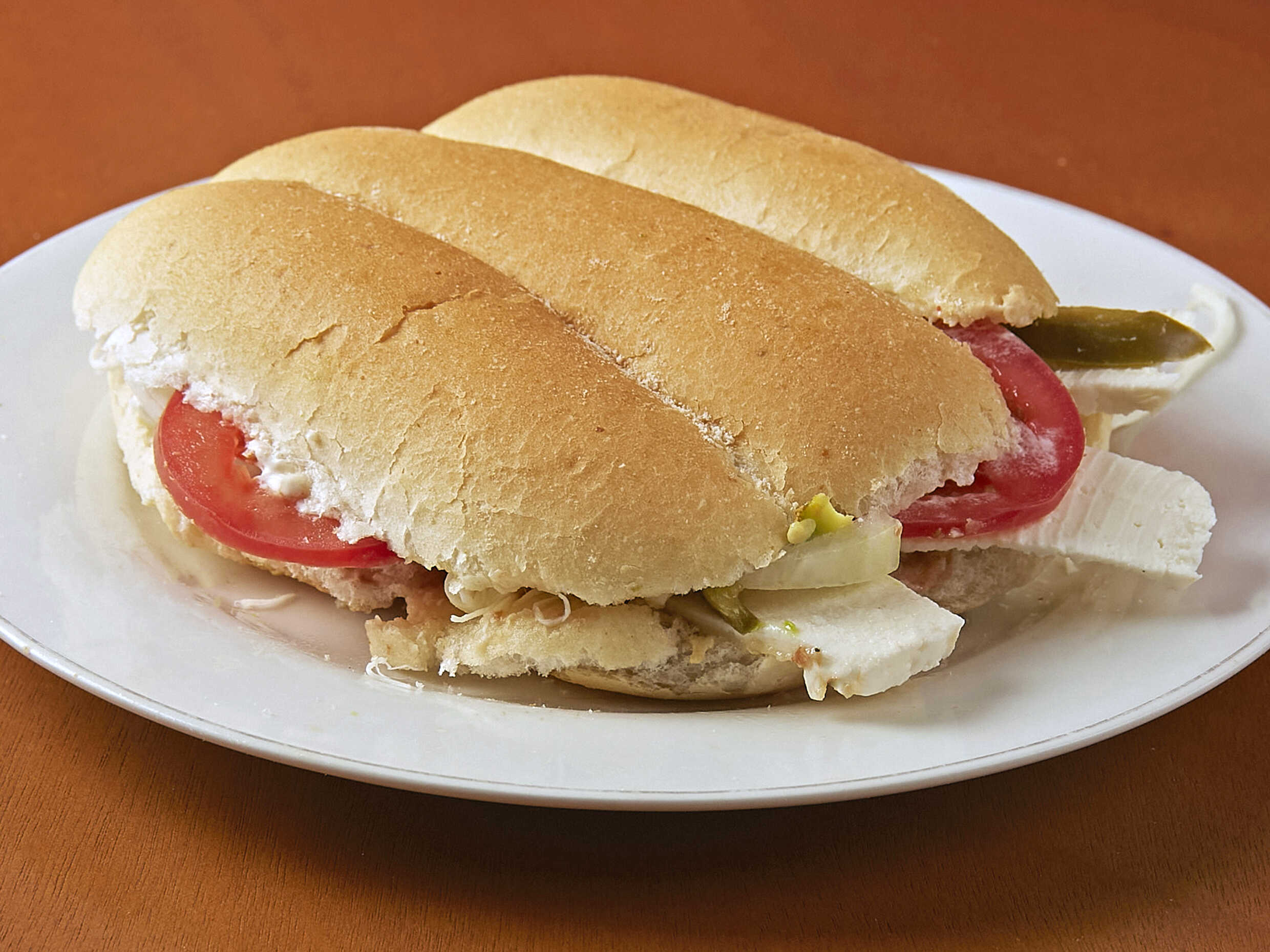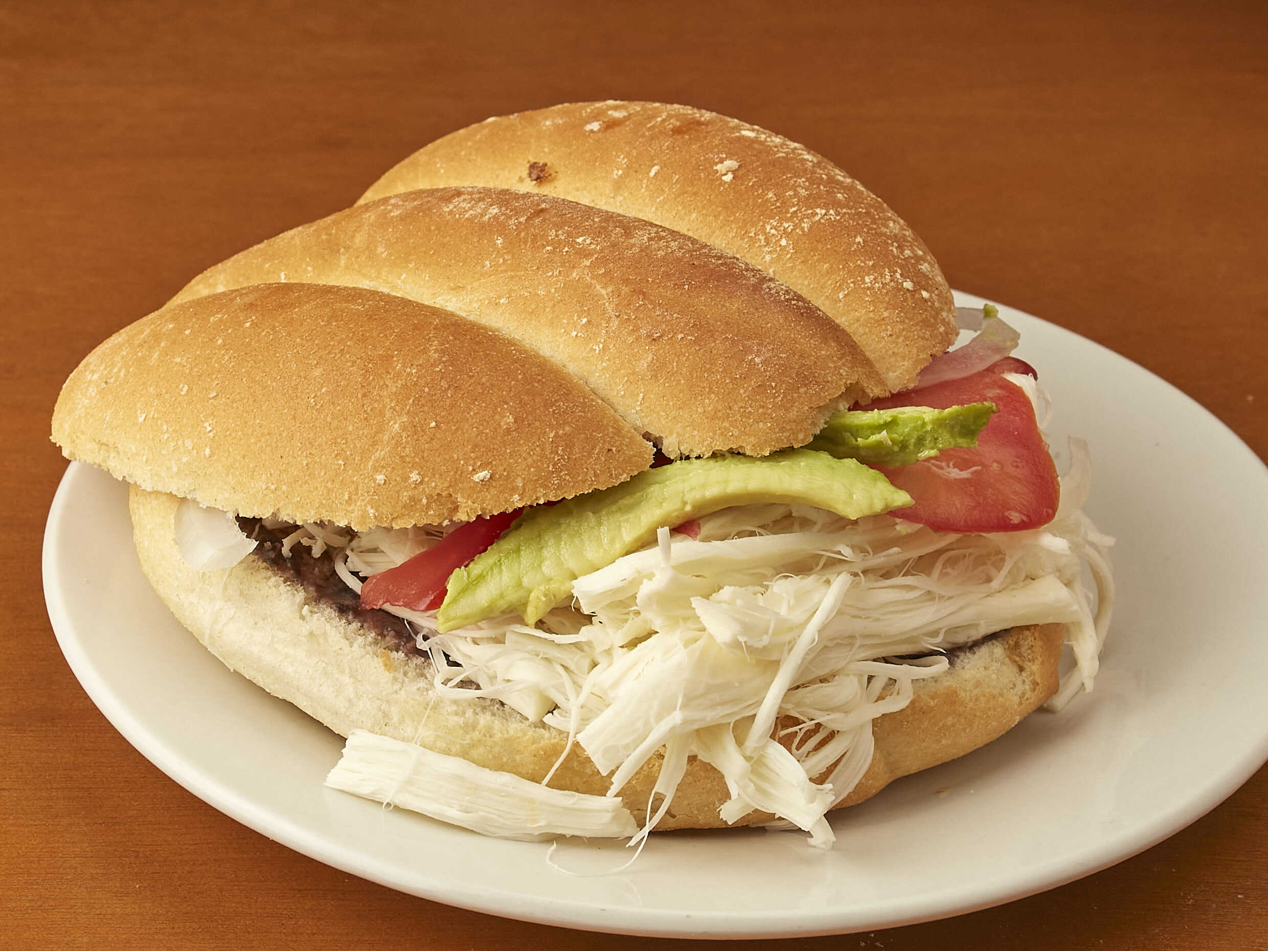 Pan de torta integrada por quesillo, aguacate, frijoles, mayonesa, jitomate, cebolla y picante a elegir.