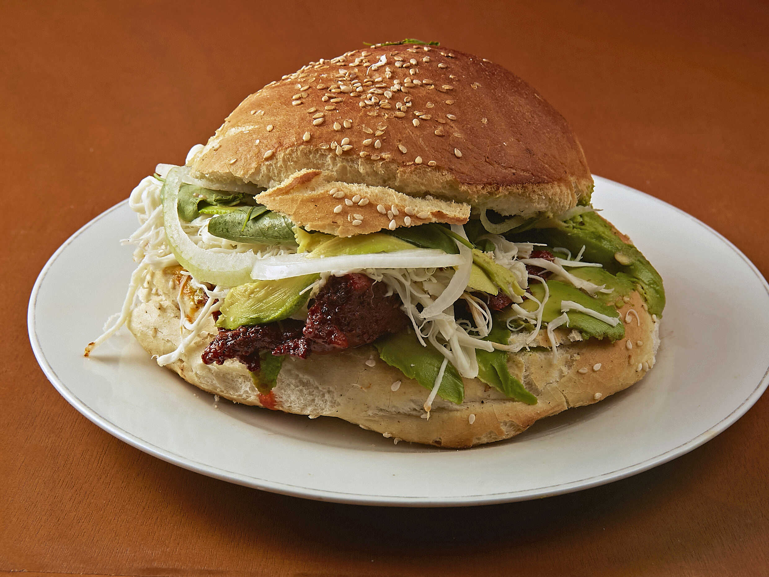Pan de torta integrada por carne enchilada, aguacate, frijoles, mayonesa, quesillo, jitomate, cebolla y picante a elegir.