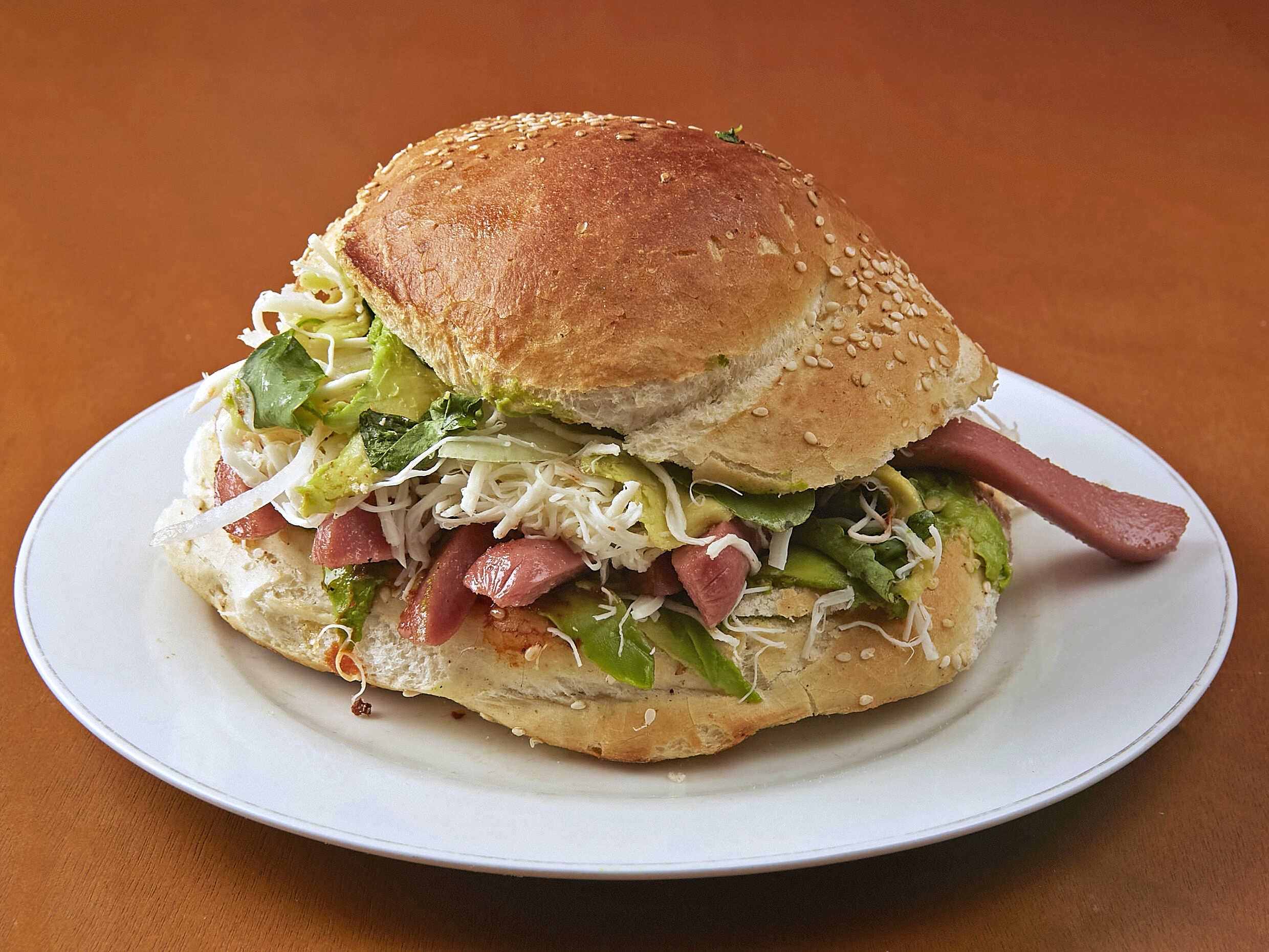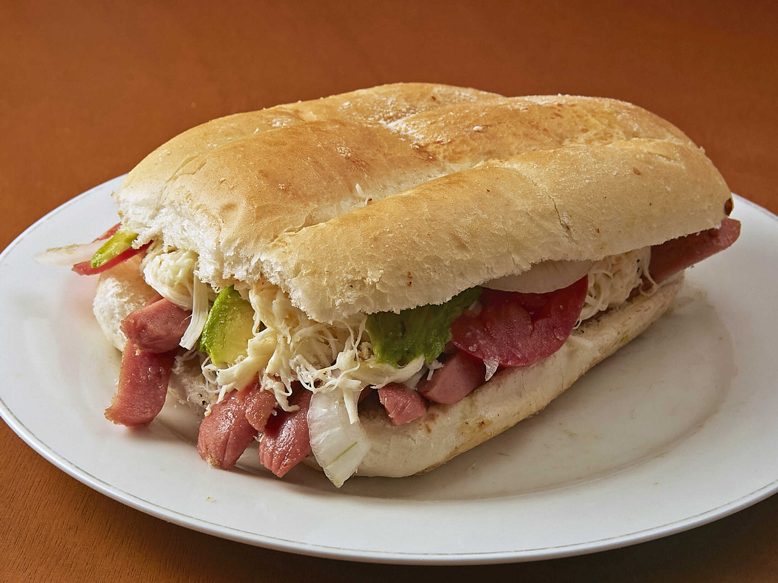 Pan de torta integrada por salchicha de pavo, aguacate, frijoles, mayonesa, quesillo, jitomate, cebolla y picante a elegir.