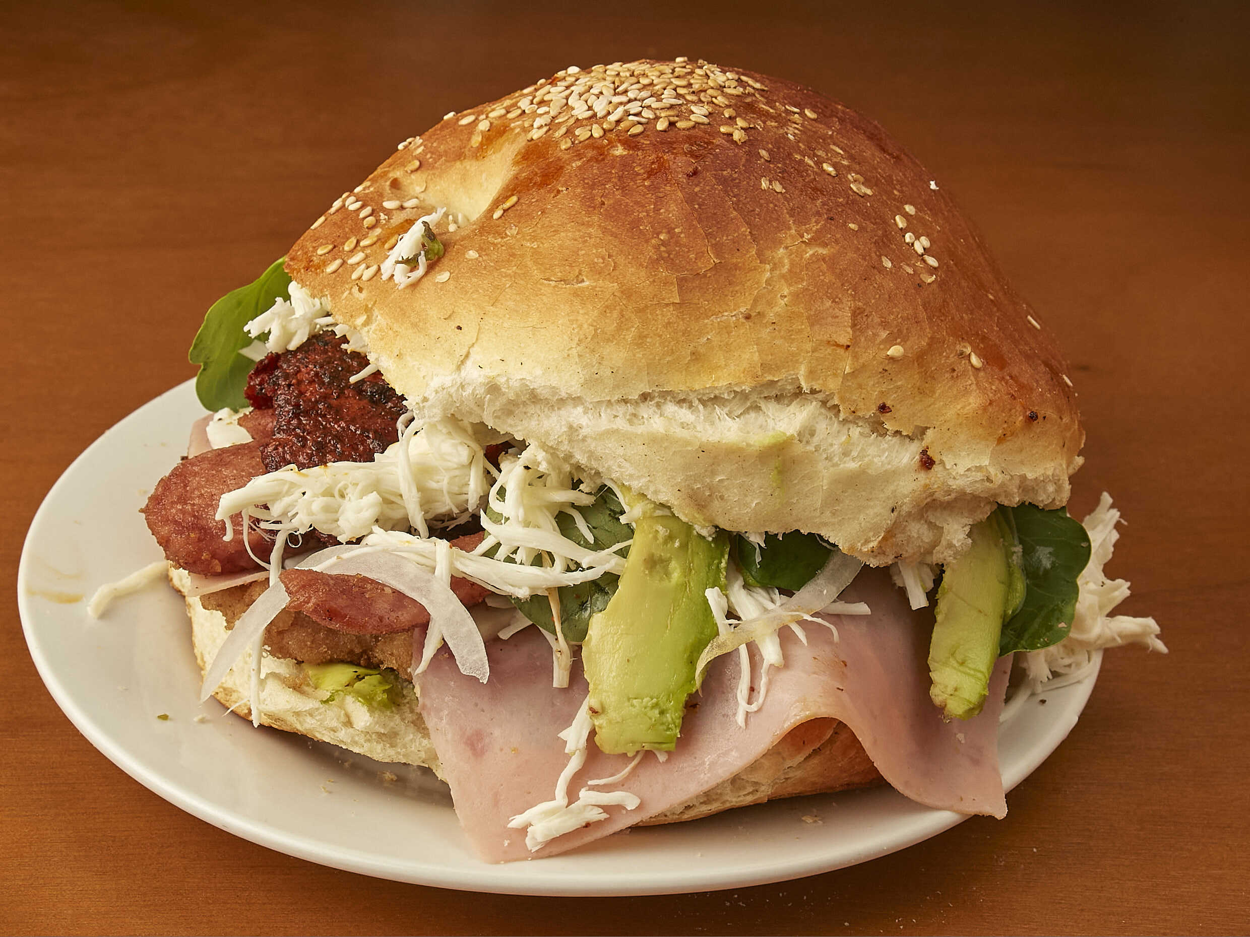 El tradicional pan de cemita poblana integrado por milanesa de cerdo, carne enchilada, jamón, queso, salchicha, aguacate, quesillo, pápalo, cebolla y picante a elegir.