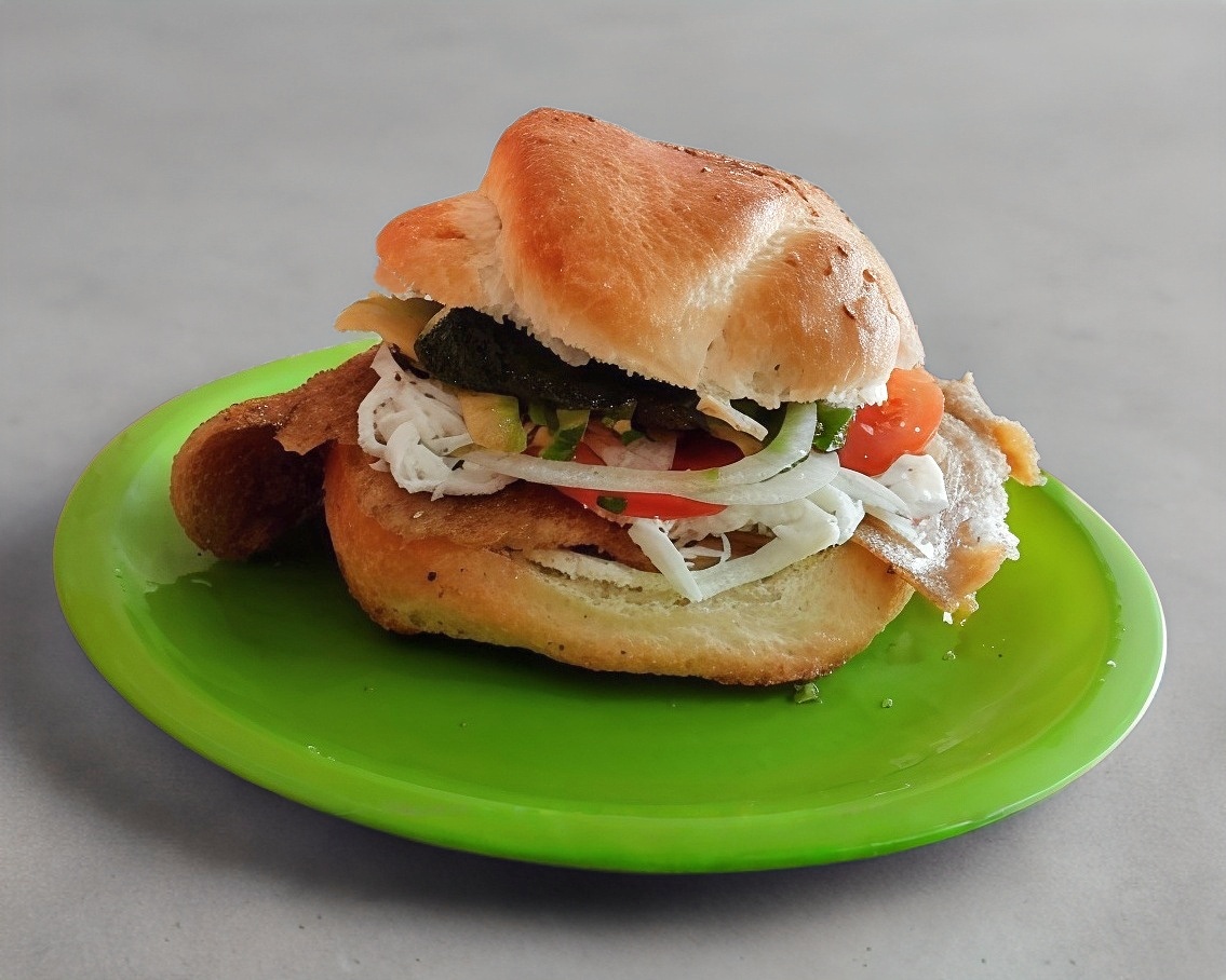 Queso de puerco, aguacate, frijoles, mayonesa, cebolla, jitomate, quesso amarillo tipo americano y picante a elección.