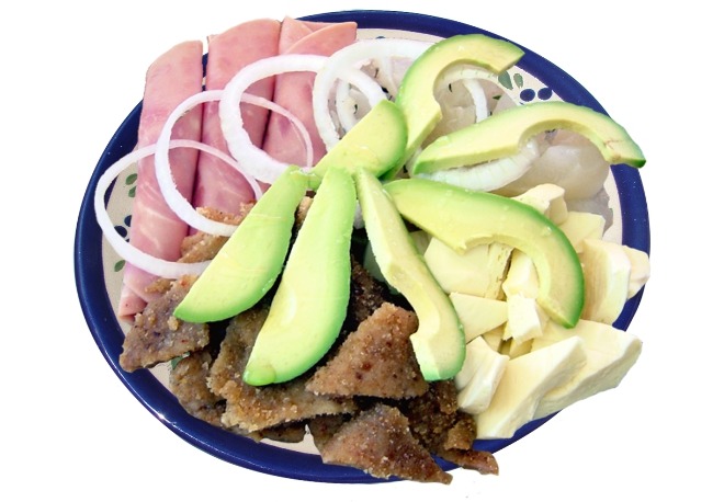 Plato acompañado de milanesa, pata, jamón, quesillo, cebolla y aguacate, entrada con aceite de olia y aguacate.