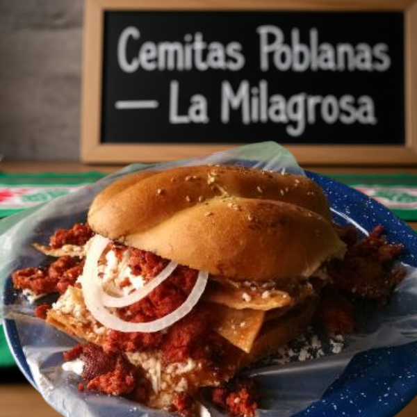 Cemita tradicional de piso, quesillo, aguacate, cebolla y milanesa crujiente de cerdo.