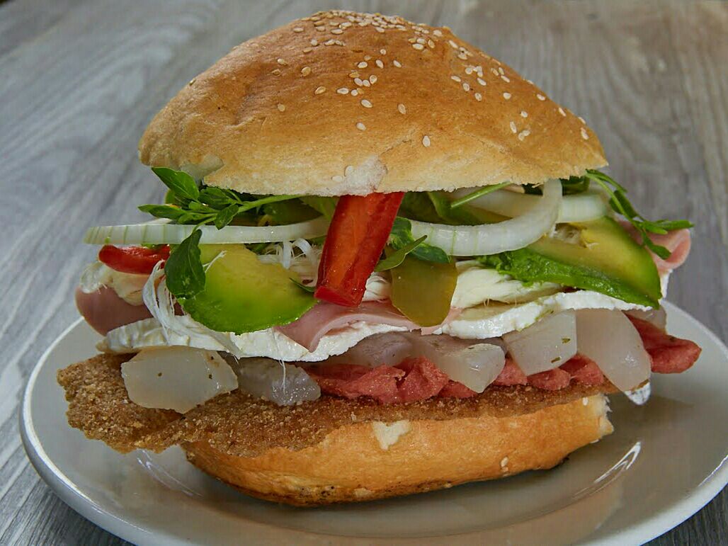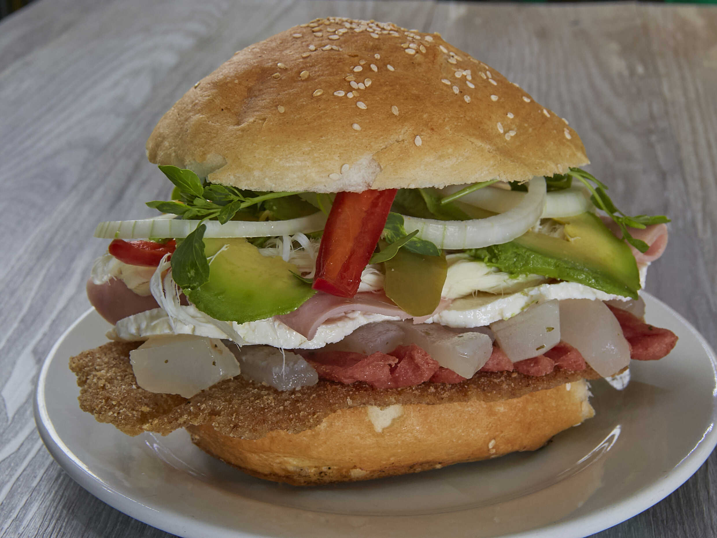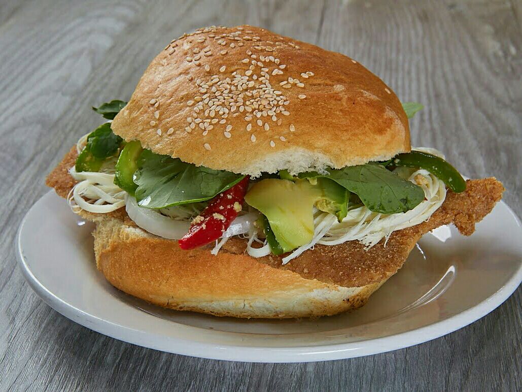 (2 cemitas super pólvora, milanesa de puerco pata, jamón, salchicha, queso) con quesillo, cebolla, picante, aguacate, pápalo