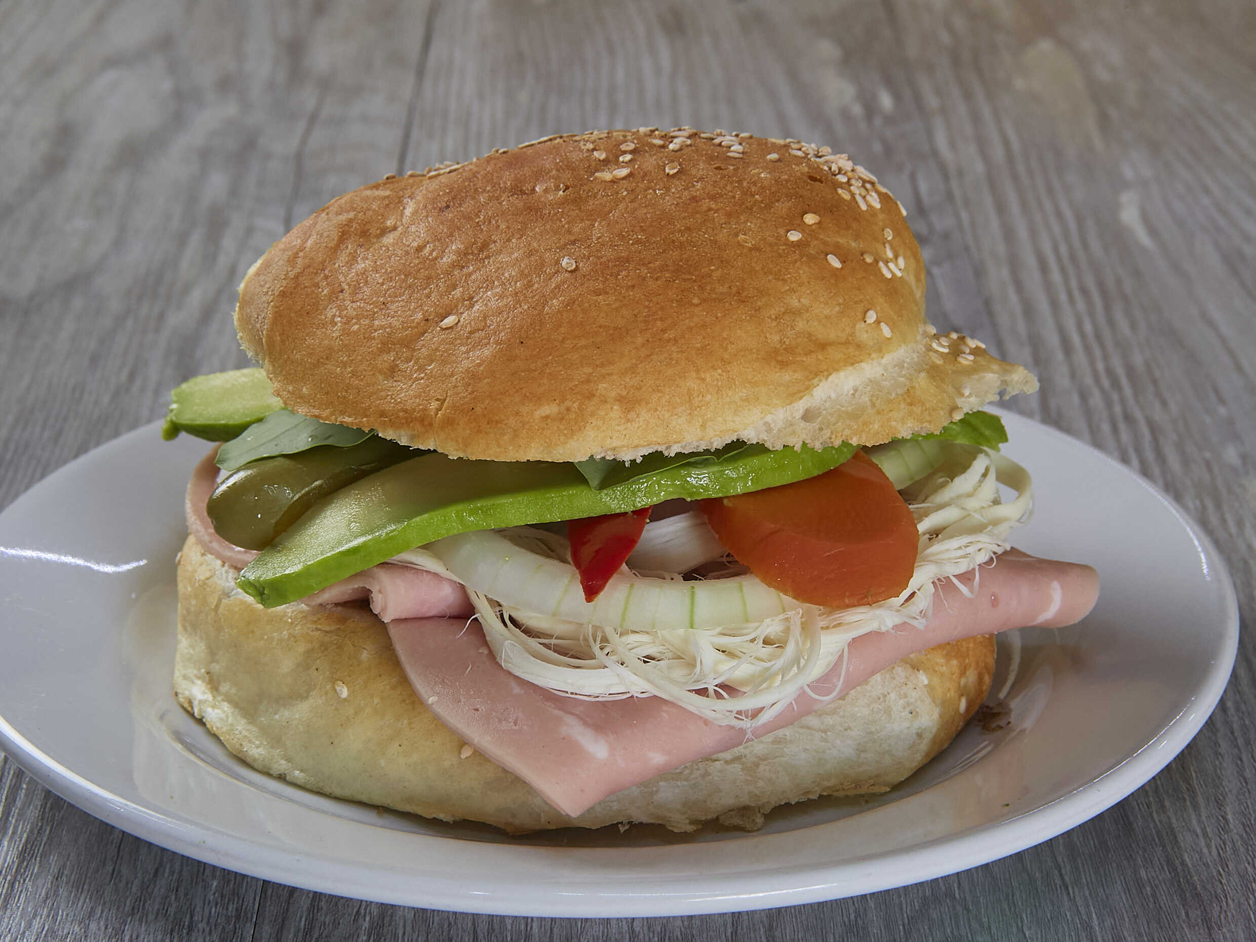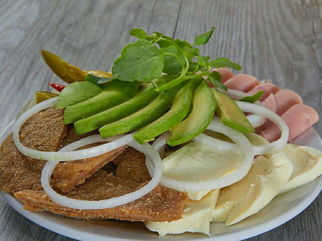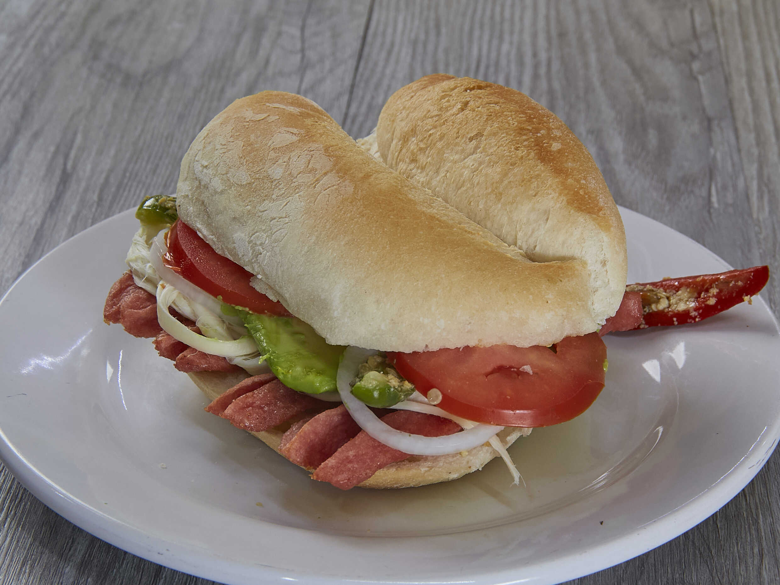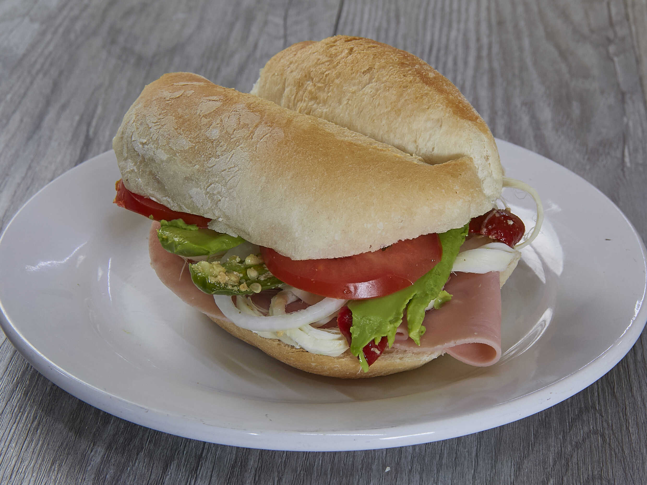 3 tortas con jamón, quesillo, aguacate, cebolla, picante, frijoles y mayonesa