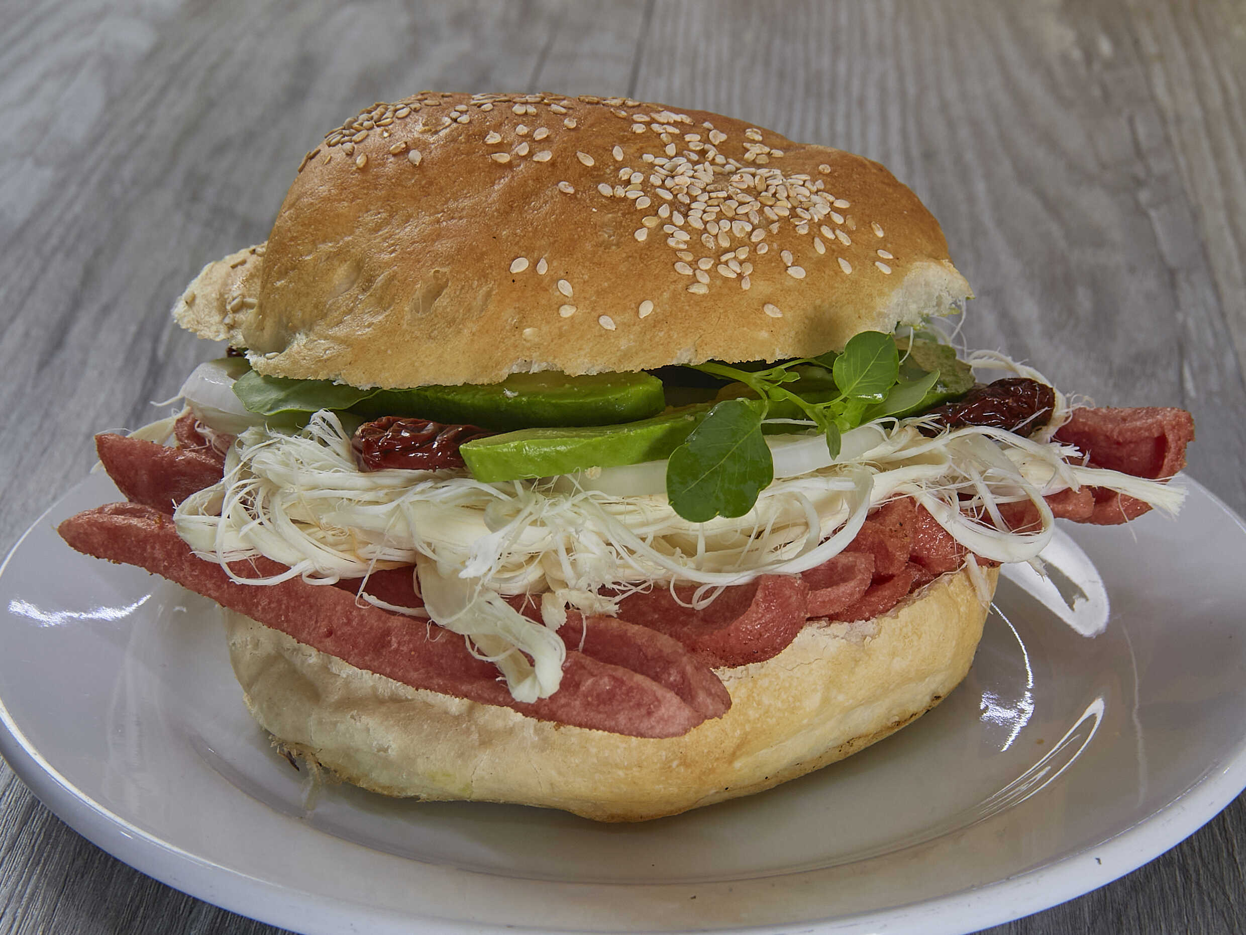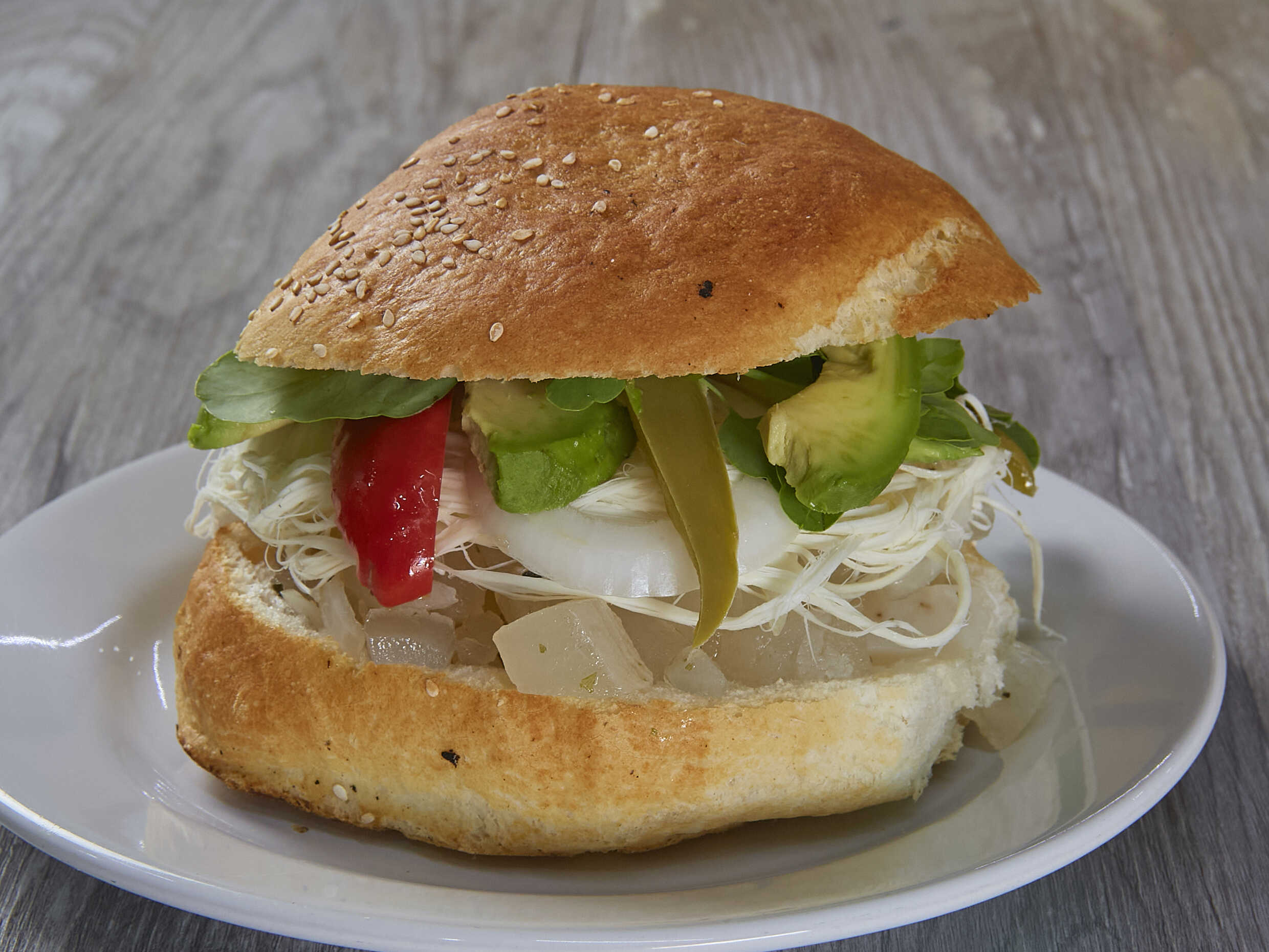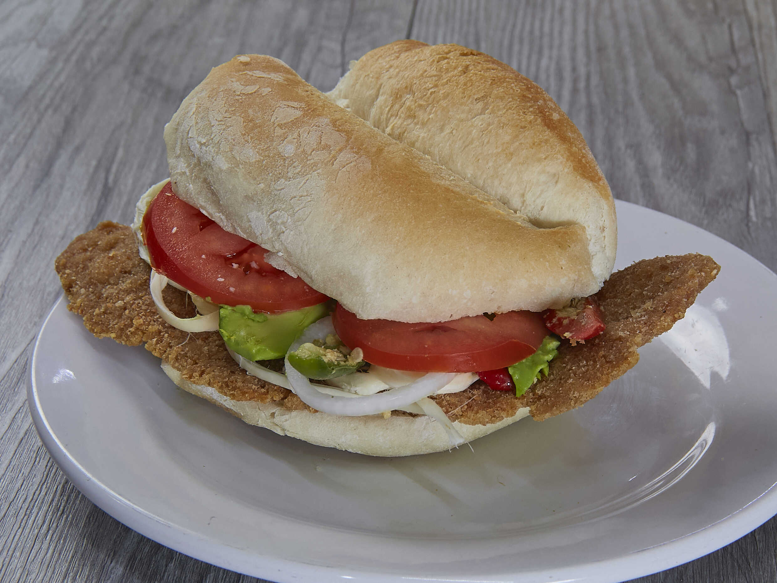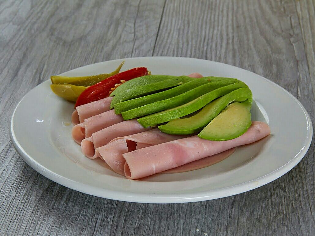 3 tortas con jamón, quesillo, aguacate, cebolla, picante, frijoles y mayonesa