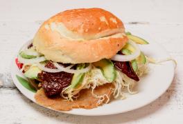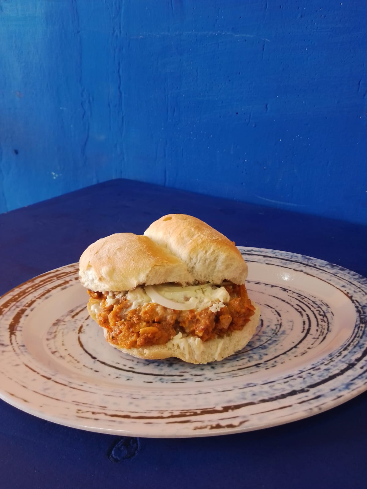 Carne enchilada jugosa con un toque de picante servida en torta recién preparada.