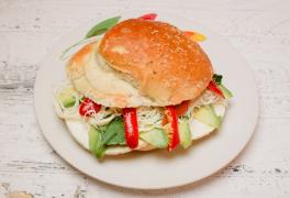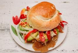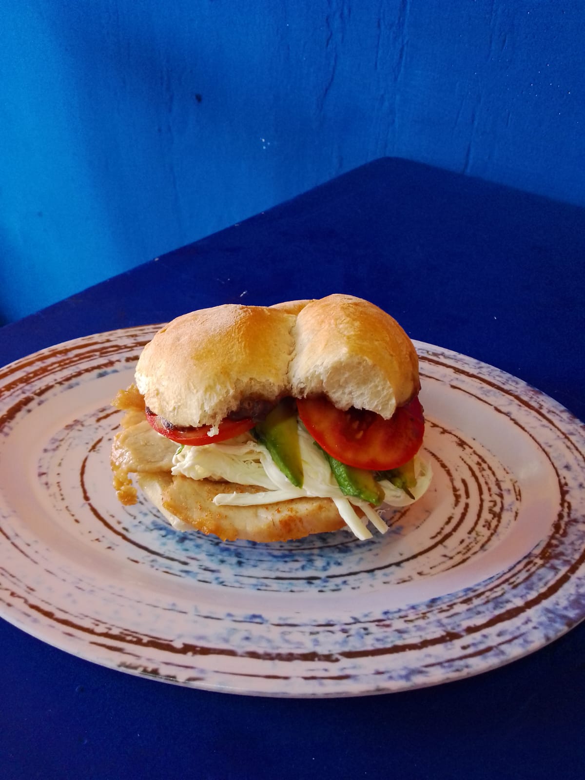 Torta de pan suave rellena de milanesa de puerco crujiente y fresca verdura.