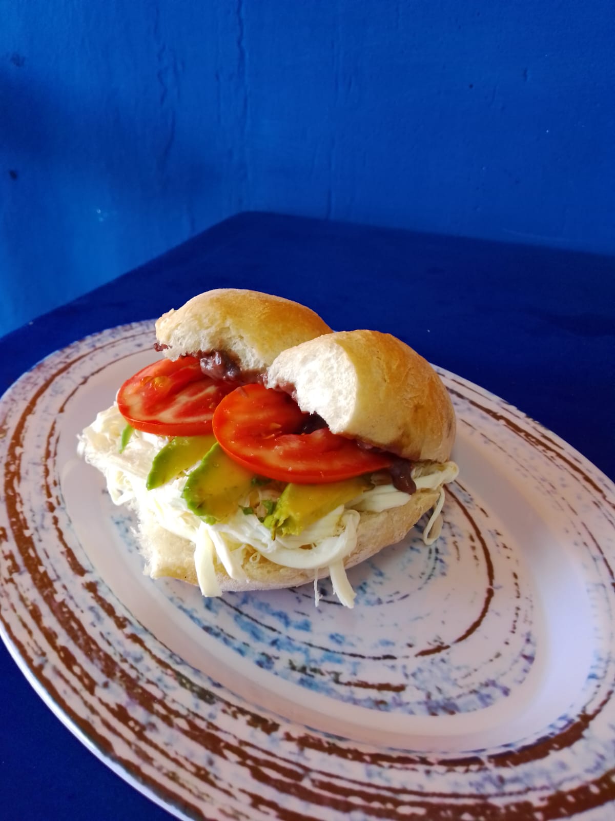 Queso blanco suave y cremoso acompañado de aguacate y cebolla en una cemita artesanal.