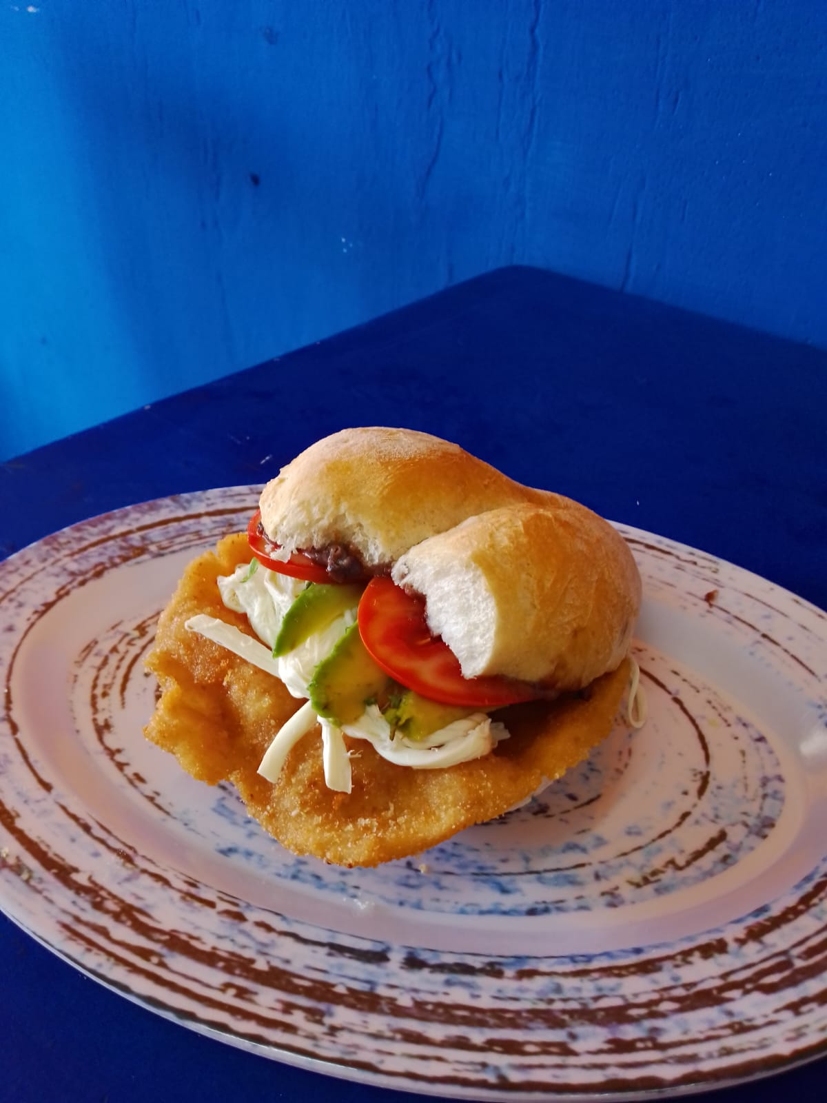 Crujiente milanesa de puerco con papalote, cebolla, aguacate y quesillo, servida en una tradicional cemita poblana.