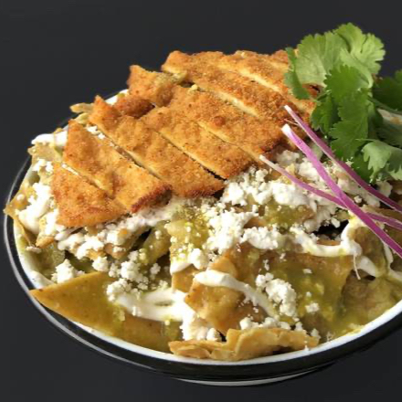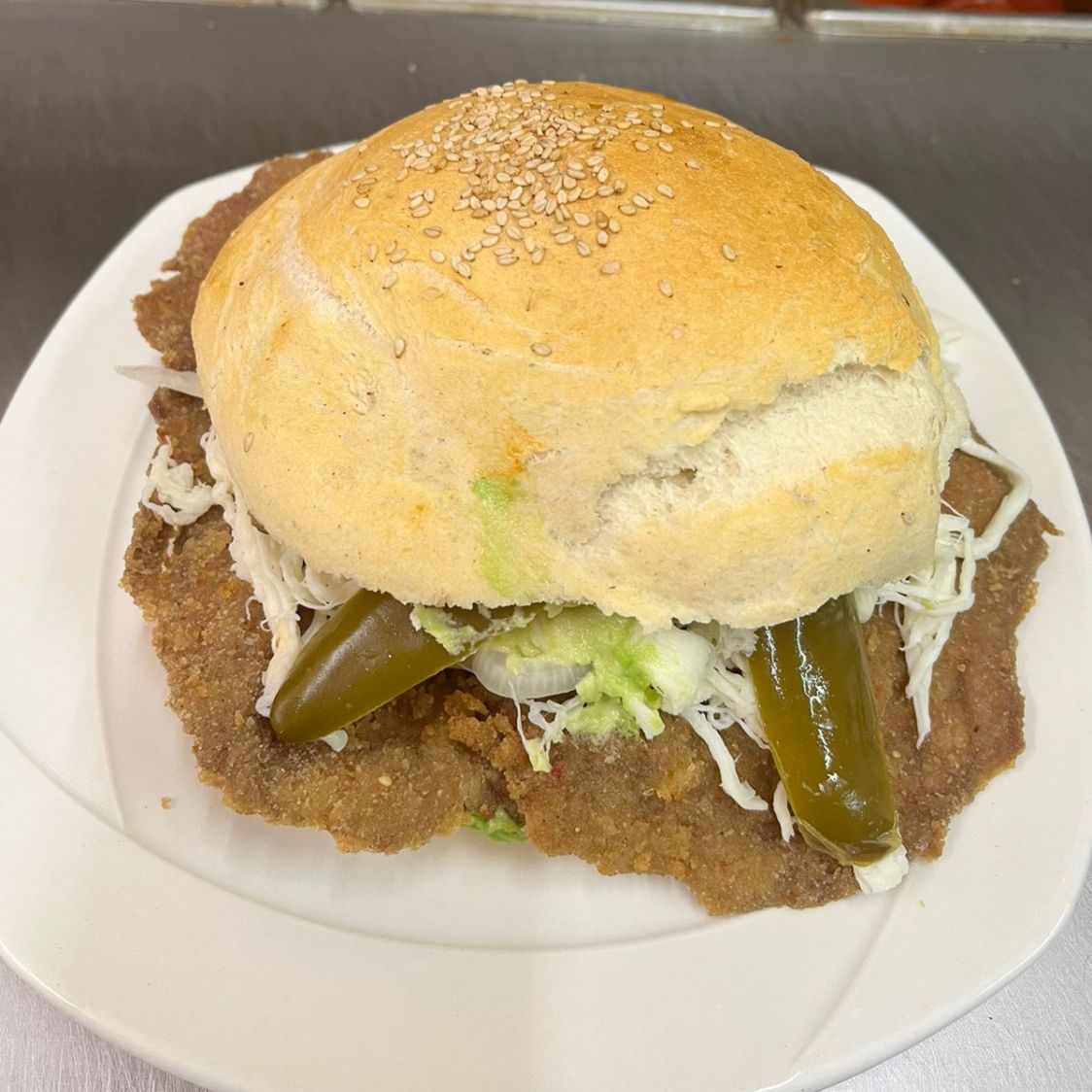 Milanesa, aguacate, jitomate, papalo, cebolla, quesillo.