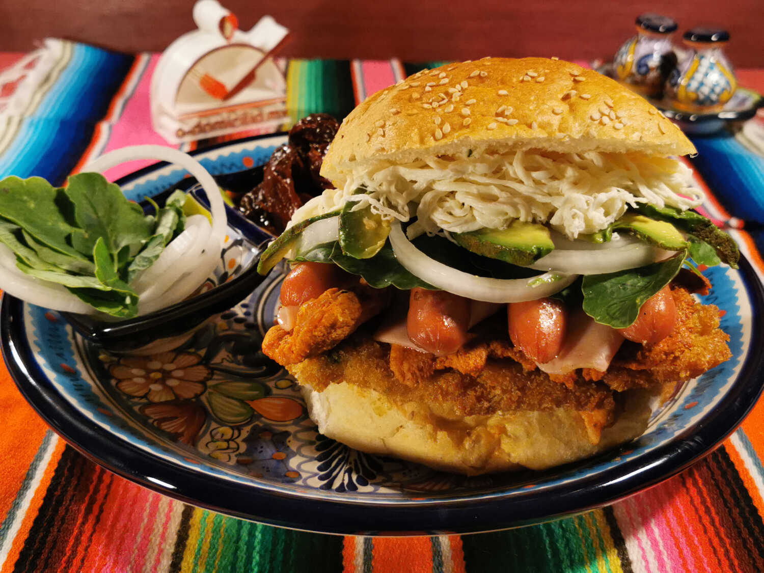 Milanesa de cerdo, jamón, salchicha, carne enchilada, quesillo, cebolla, aguacate y pápalo.