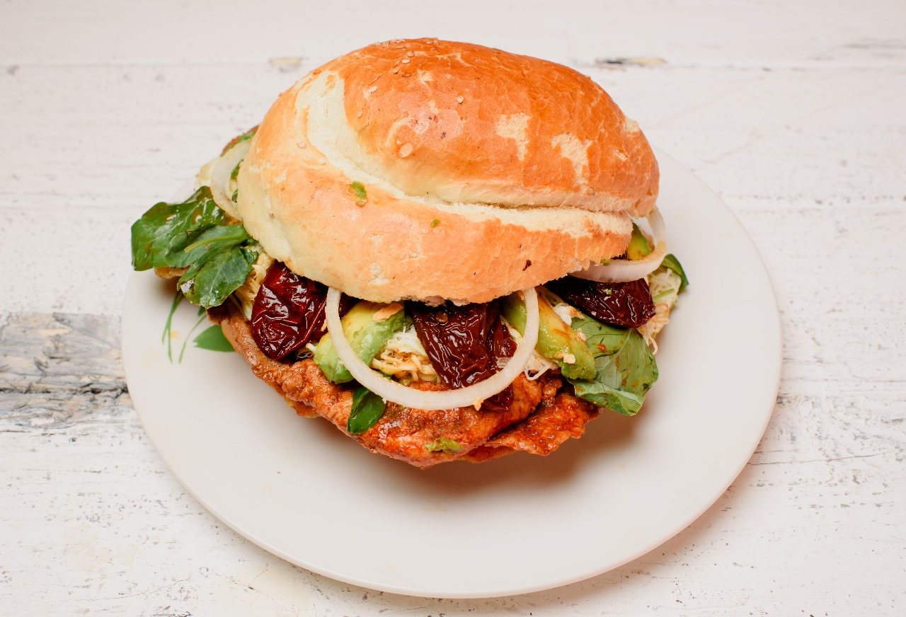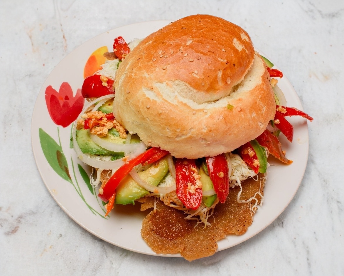 Cemita de milanesa de pollo (75 g). Ingredientes: aguacate, cebolla, pápalo y quesillo. incluye salsa picante(Porcion personal)