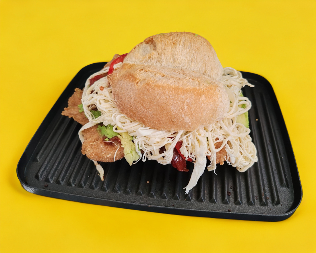 Aguacate, milanesa de pollo, quesillo, jamón, cebolla, pápalo y picante.