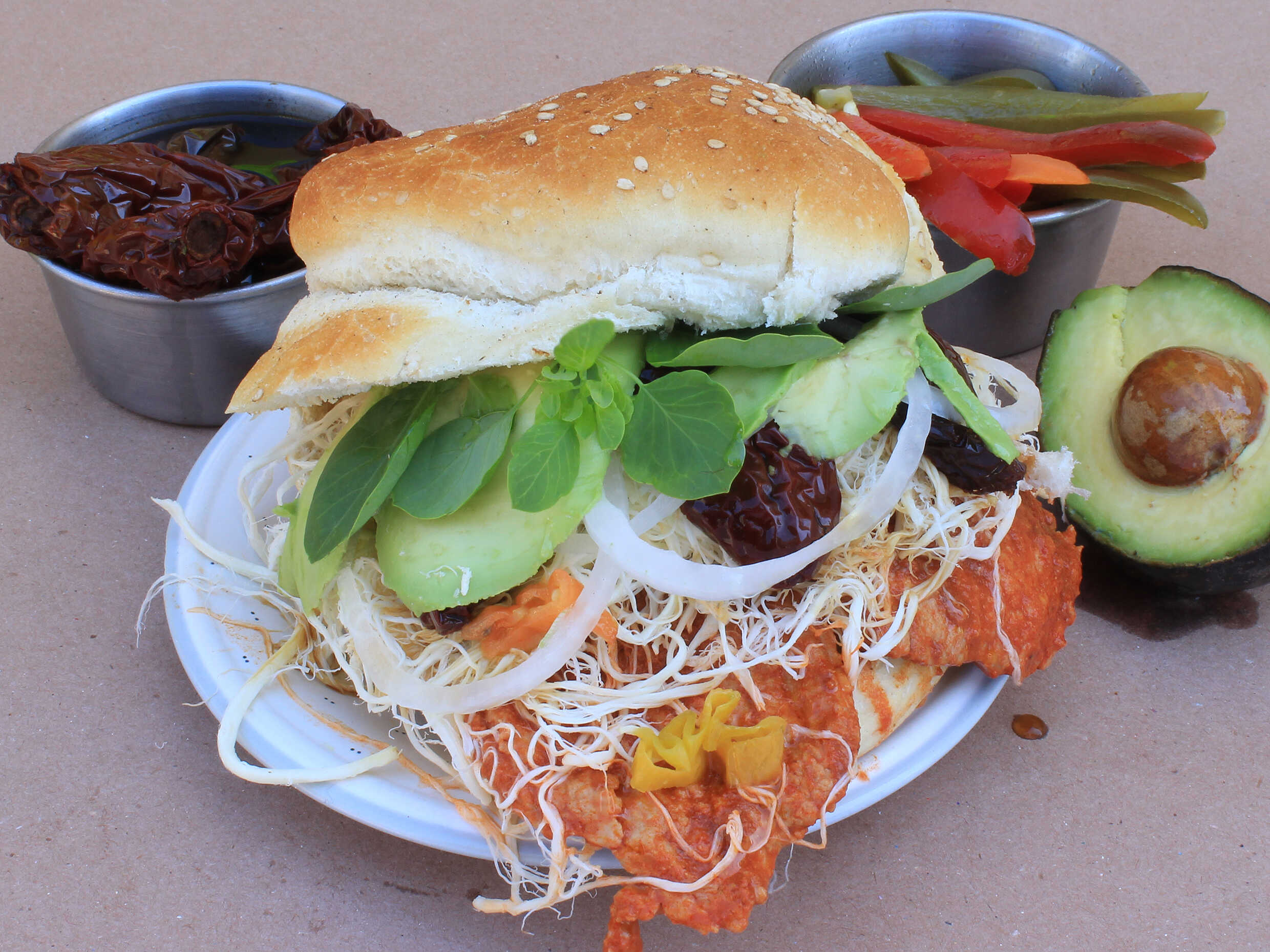 Pan tipo cemita, pata de res preparada, quesillo, picante, cebolla, aguacate, aceite de oliva, papalo