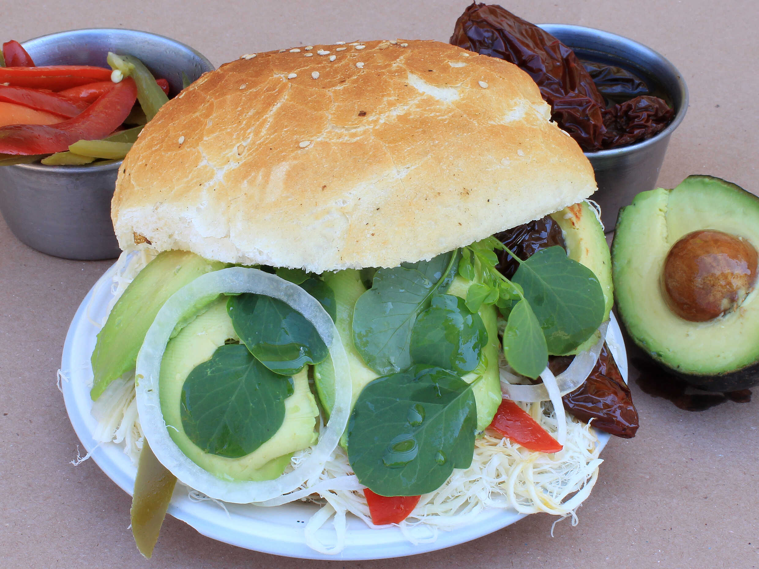 Pan tipo cemita, quesillo desebrado, picante, cebolla, aguacate, aceite de oliva, papalo