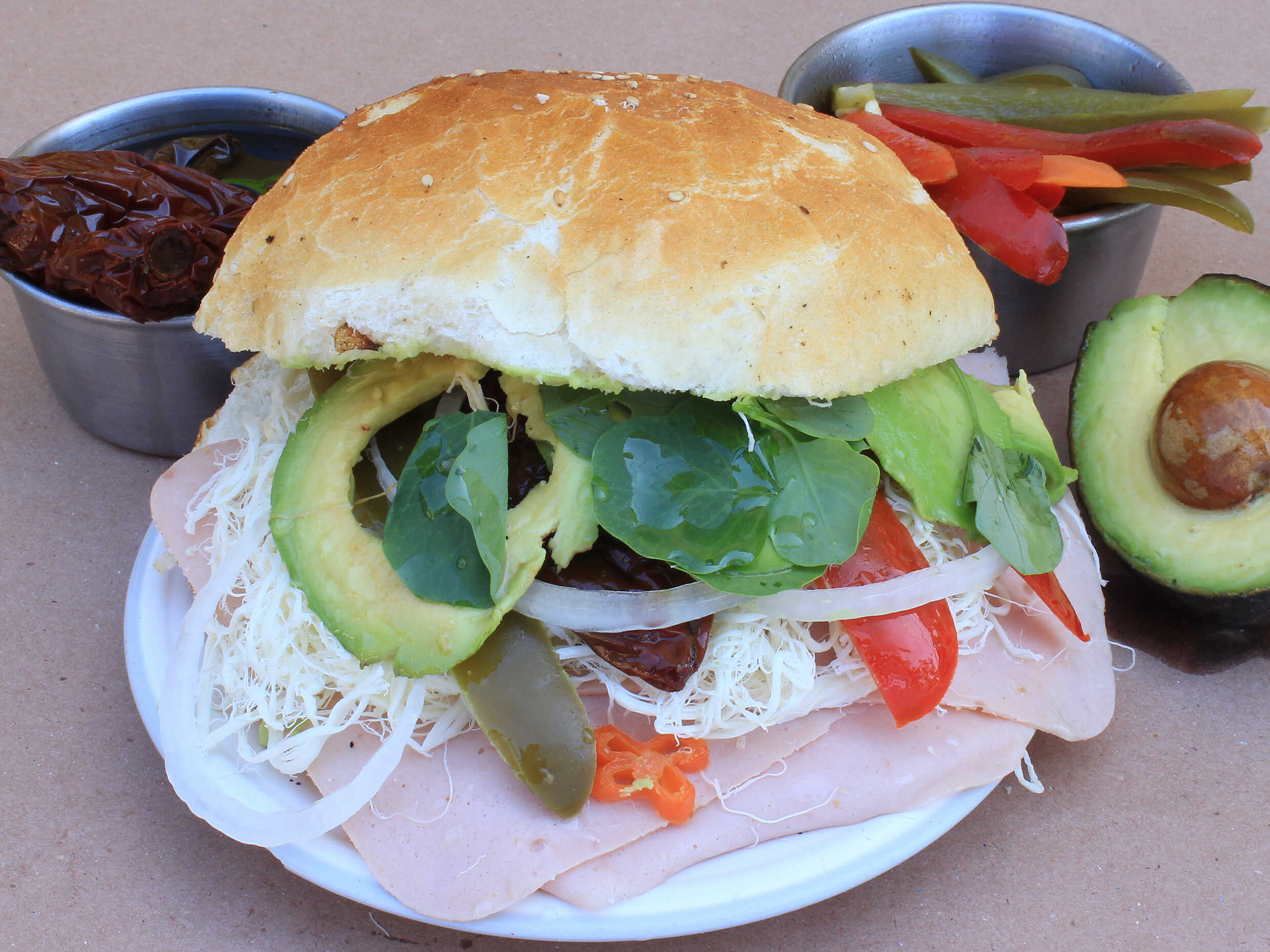 Pan tipo cemita, jamón, picante, cebolla, aguacate, aceite de oliva, papalo