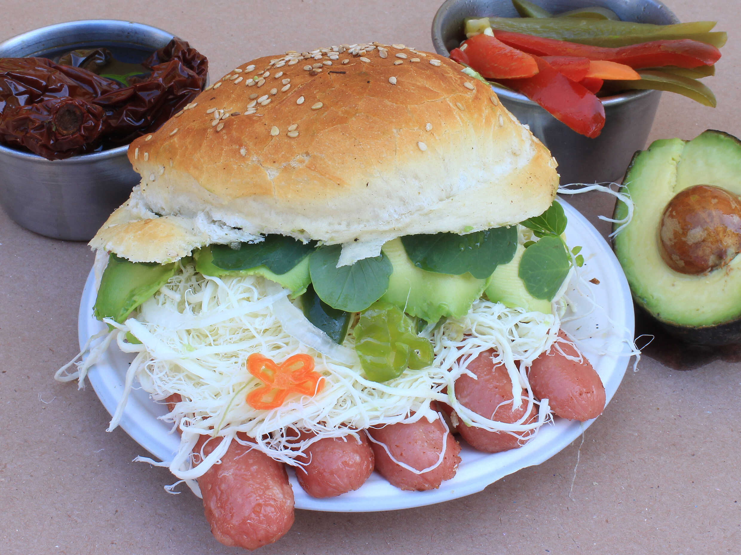Pan tipo cemita, salchicha, quesillo, picante, cebolla, aguacate, aceite de oliva, papalo