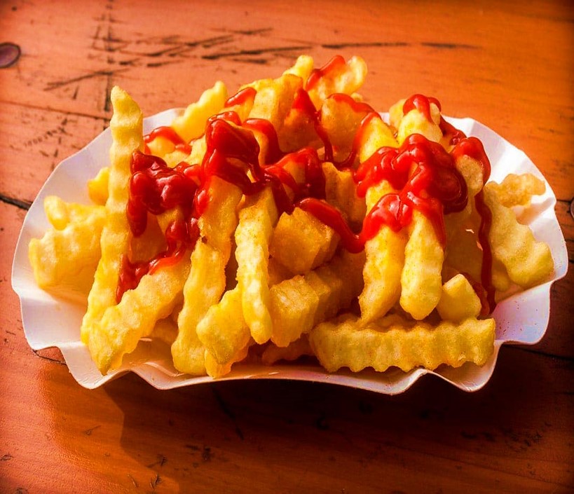 Papá natural frita con cátsup mayonesa y Valentina.