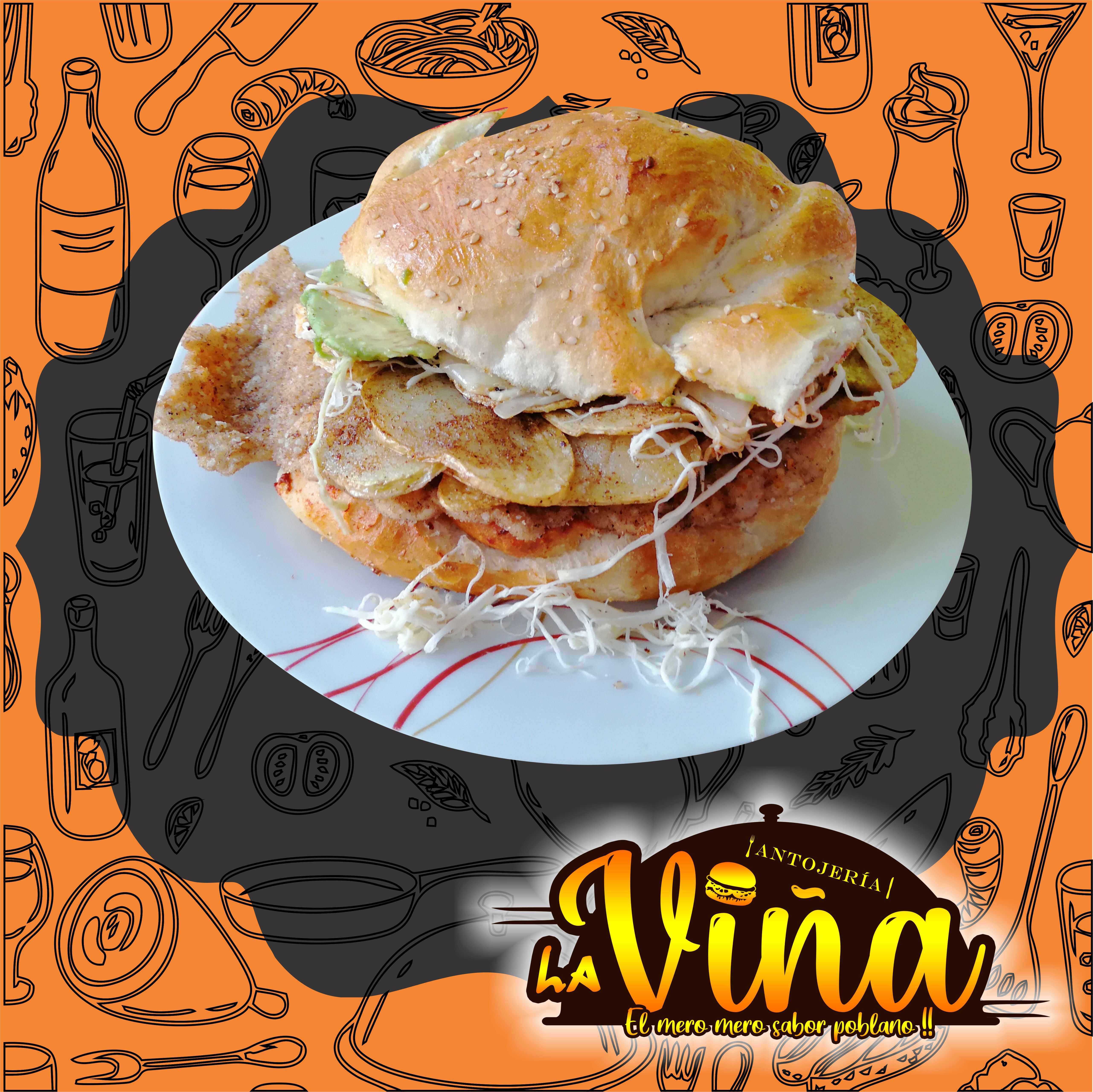 Milanesa de puerco, quesillo, aguacate, cebolla y pápalo.
