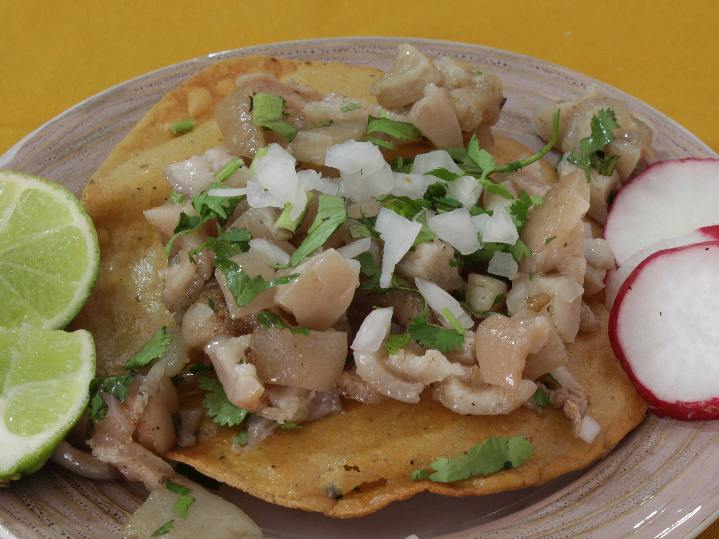 con carne 100%Lengua,lechuga,cebolla,rabanos,limones,tostadas,oregano y picante en polvo.
