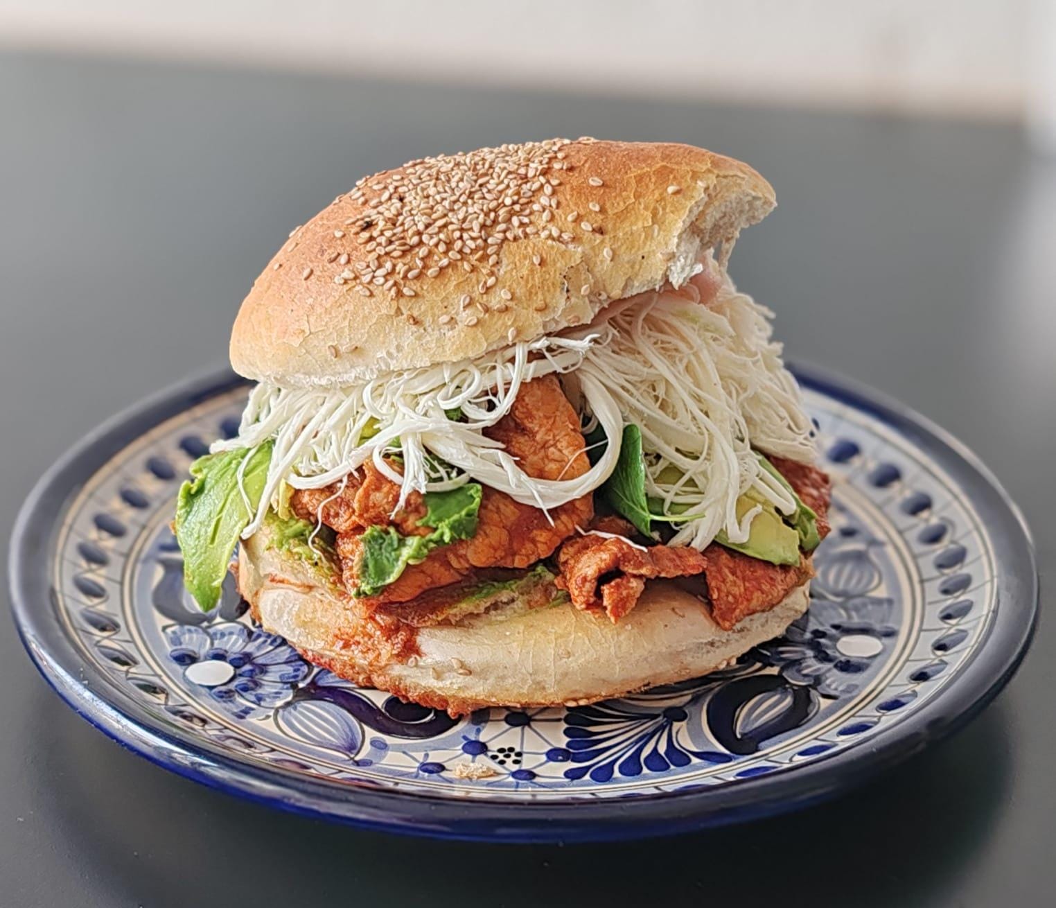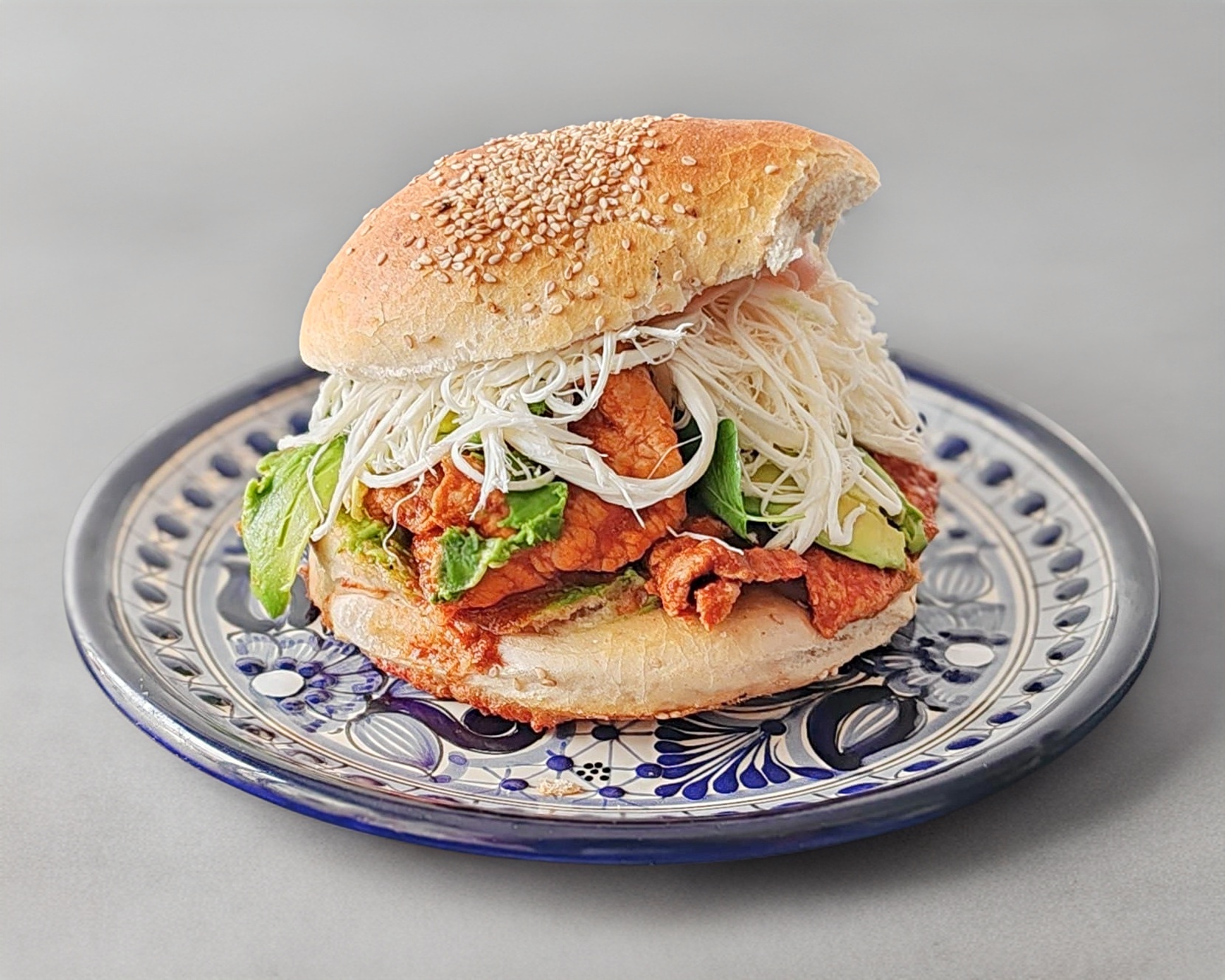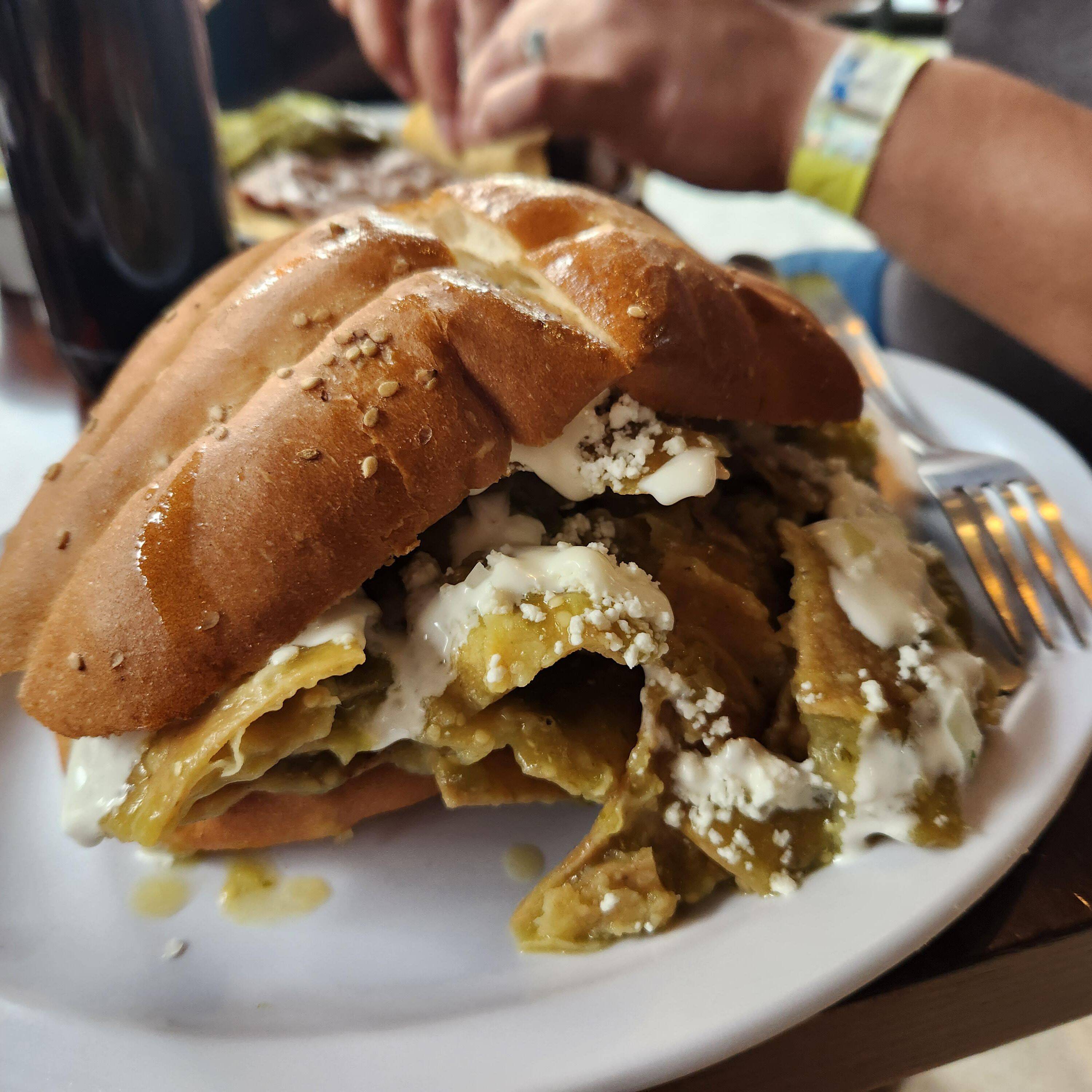 Torta de milanesa acompañada de quesillo aguacate pápalo y picante de tu elección