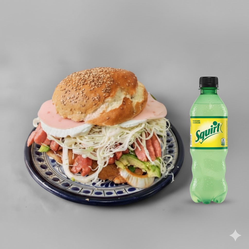 2 refresco, + dos cemitas con quesillo pápalo aguacate y frijoles y picante de su elecciónde 🔥