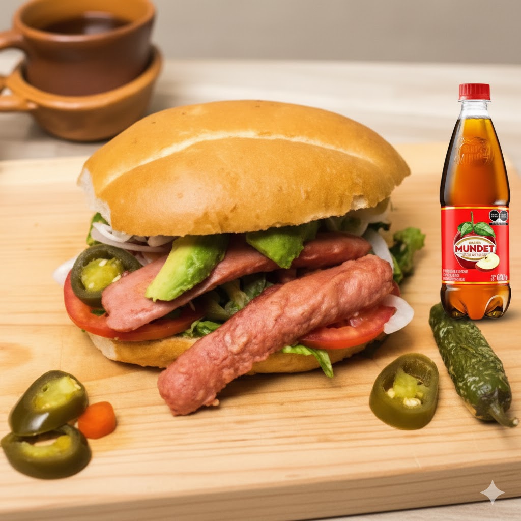 Jamón, milanesa, aguacate, salchicha, rajas o chipotle, quesillo y pápalo incluye agua.