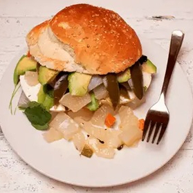 Pan artesanal, cebolla, pápalo, picante, aguacate, quesillo o queso, milanesa de pollo.