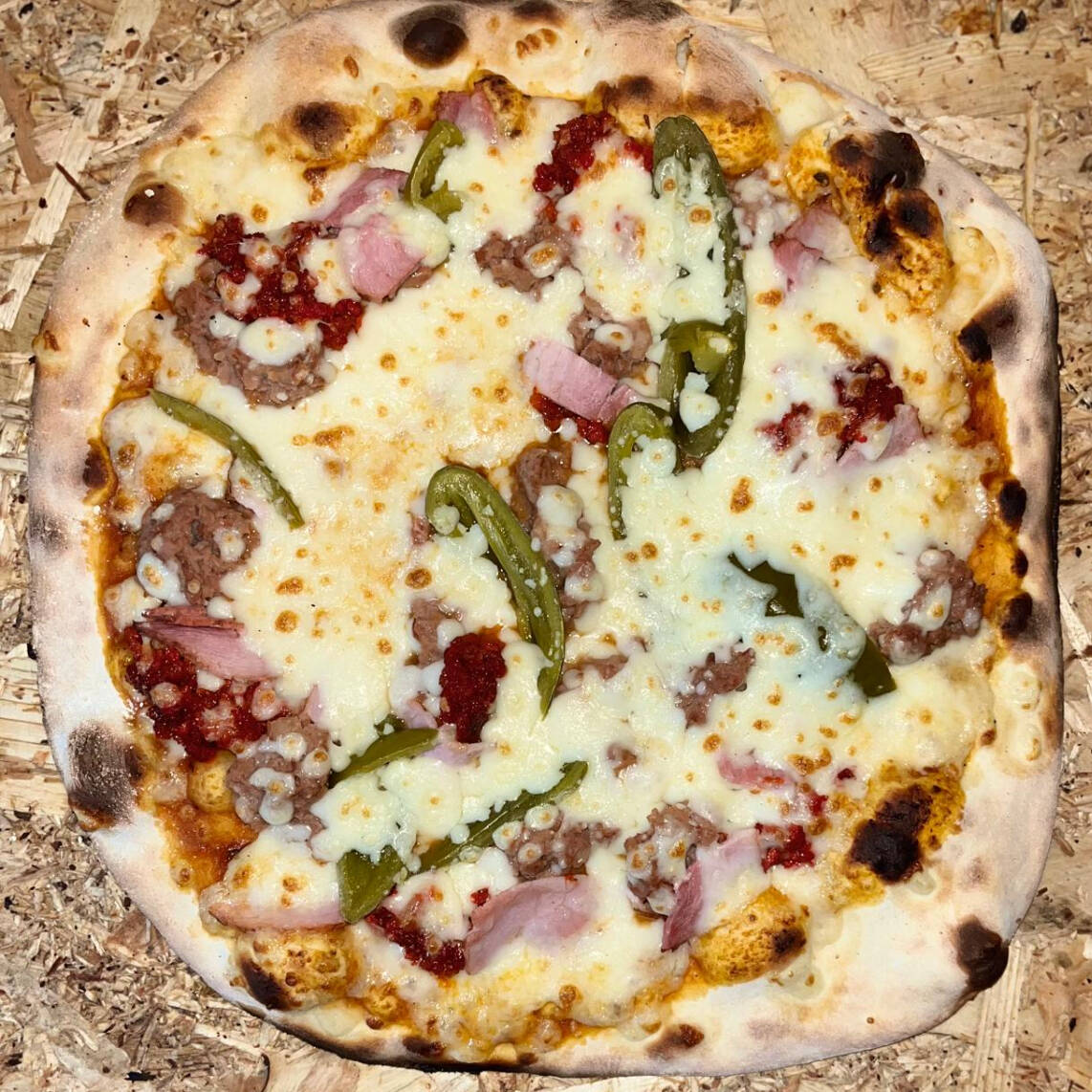 Base Salsa de Tomate, Queso Mozzarella, Chorizo, Tocino, Frijol y Rajas.