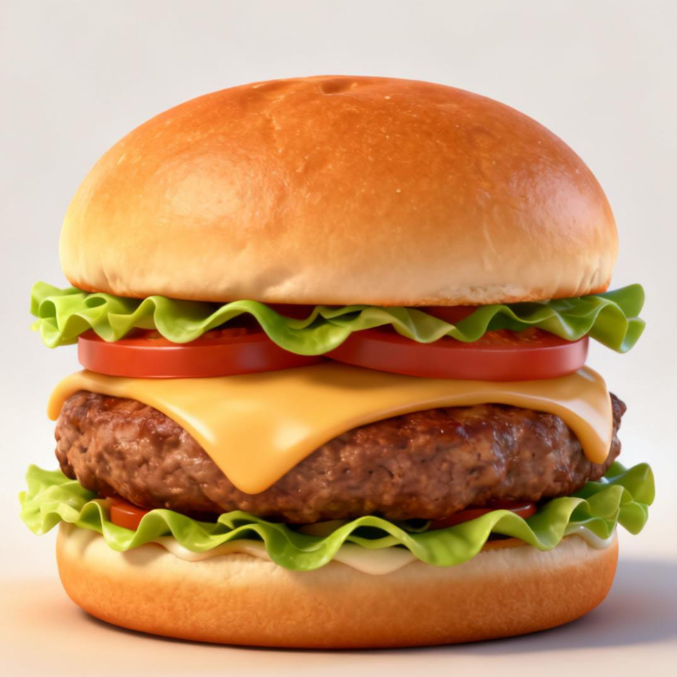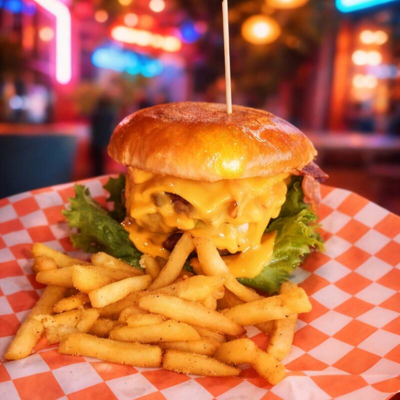 Hamburguesa clásica con carne de res,queso,tocino, lechuga,tomate y pepinillos