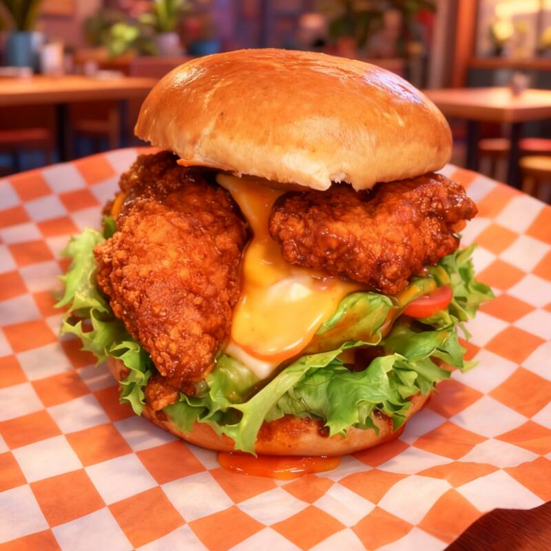 Pan brioche,con crujientes boneless bañados en salsa de la casa aderezo ranch ,tomate lechuga pepinillos.