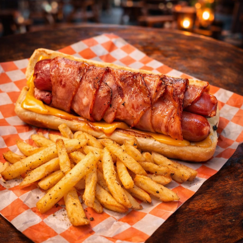 Hot dog con doble salchicha jumbo relleno de piña queso mozzarella, jalapeño,envuelta en tocino