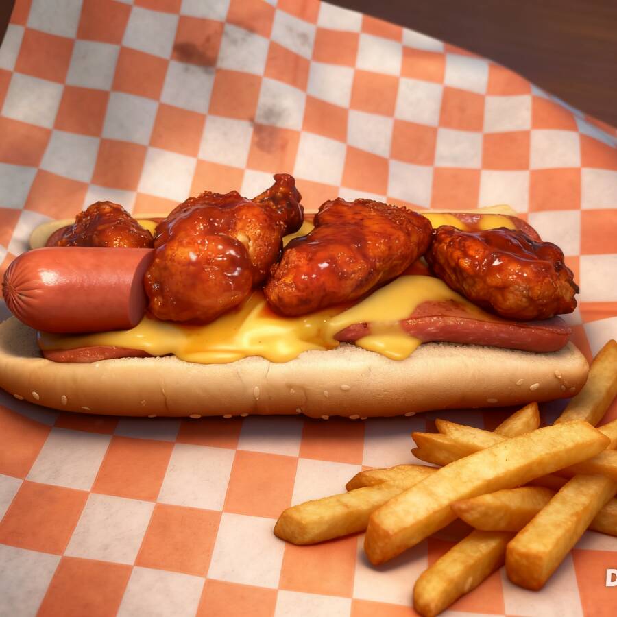 Delicioso hotdog jumbo,con salchicha jumbo , boneless con salsa de la casa ,queso chedar y aderezo ranch.