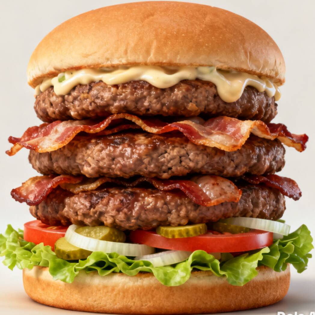 Triple carne de sirloin,extra queso,extra tocino,salchicha lechuga, tomate y pepinillos