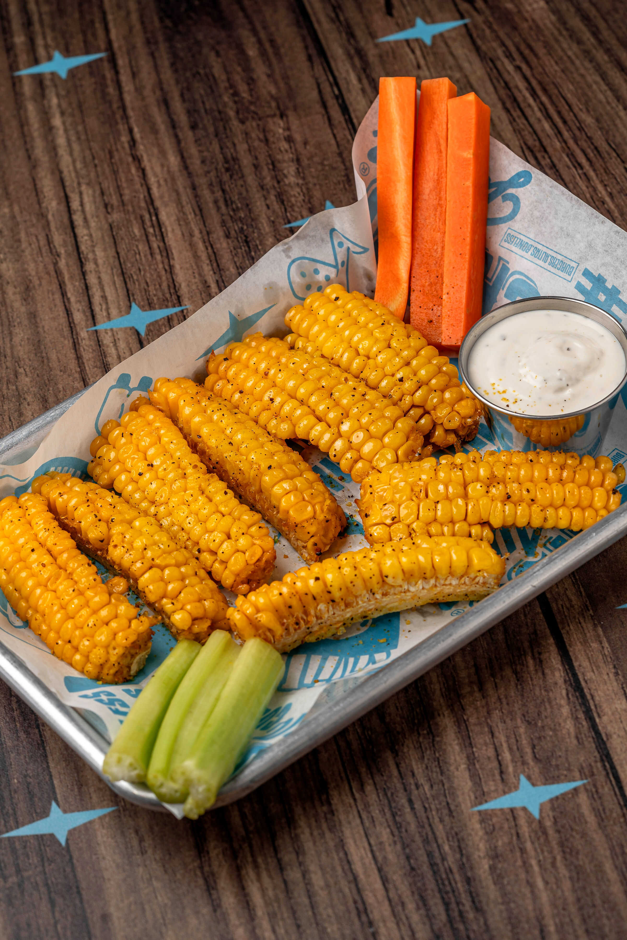 Deliciosa botana a base de elotes fritos con un toque de nuestro lemon pepper acompañado de aderezo ranch.