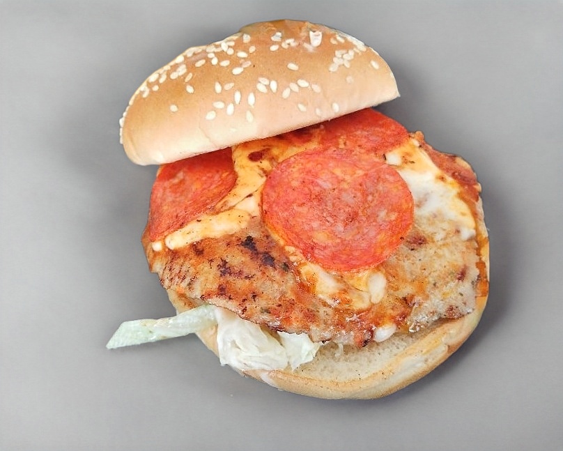 Hamburguesa bañada en salsa de tomate para pizza con queso mozarella peperoni y un toque de parmesano