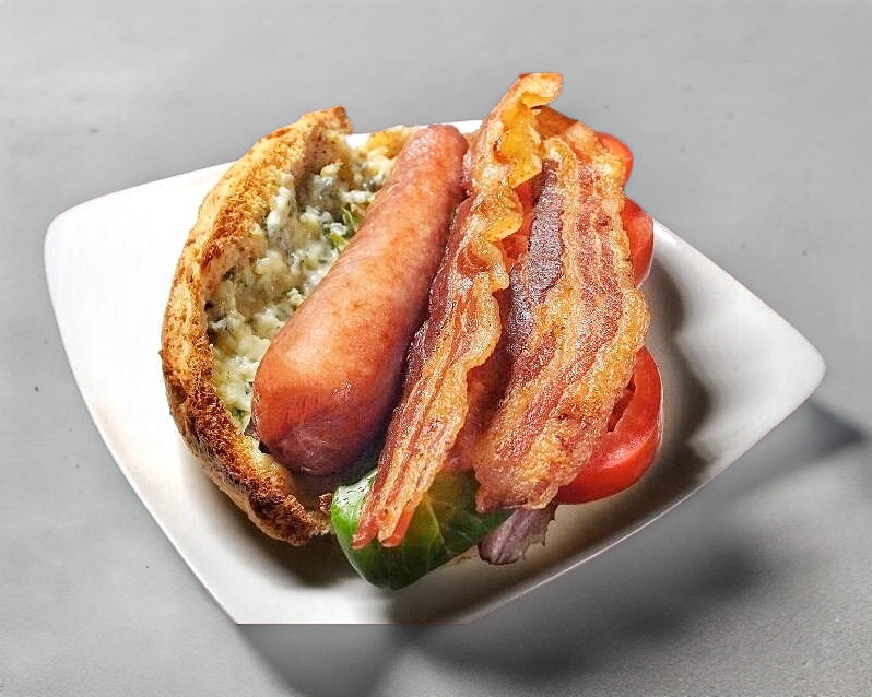 Salchicha jumbo, 2 tiras de tocino, jitomate, cebolla, chile y aderezos.