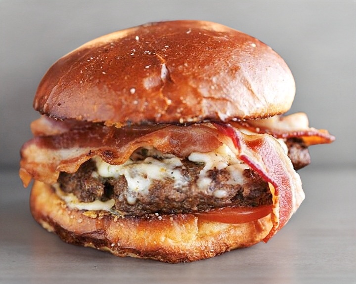 Hamburguesa con 2 tiras de tocino, queso amarillo, lechuga, tomate, cebolla caramelizada, aderezos y picante.