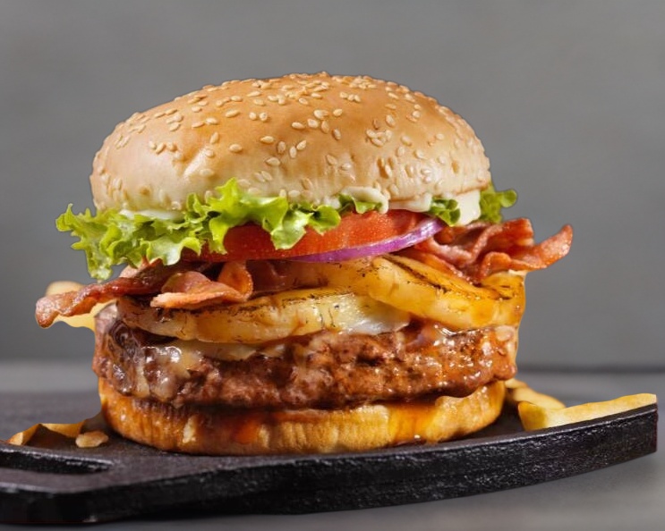Hamburguesa con piña, jamón, quesillo, queso amarillo, lechuga, tomate, cebolla caramelizada, aderezos y picante.